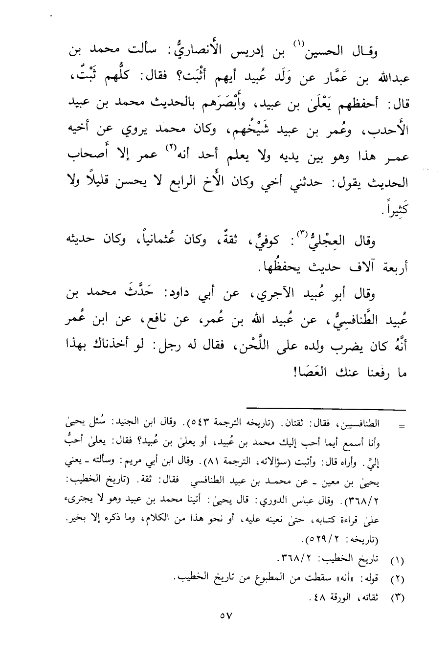وَقَال الْحُسَيْن (1) بْن إدريس الأَنْصارِيّ: سألت مُحَمَّد بْن عَبد اللَّهِ بن عمار عن ولد عُبَيد أيهم أثبت؟ فقال: كلهم ثبت، قال: أحفظهم يَعْلَى بن عبد، وأبصرهم بالحديث مُحَمَّد بن عُبَيد الأحدب، وعُمَر بن عُبَيد شيخهم، وكان مُحَمَّد يروي عن أخيه عُمَر هذا وهو بين يديه ولا يعلم أحد أنه (2) عُمَر إلا أصحاب الحديث يقول: حَدَّثَنِي أخي وكان الأخ الرابع لا يحسن قليلا ولا كثيرا.
