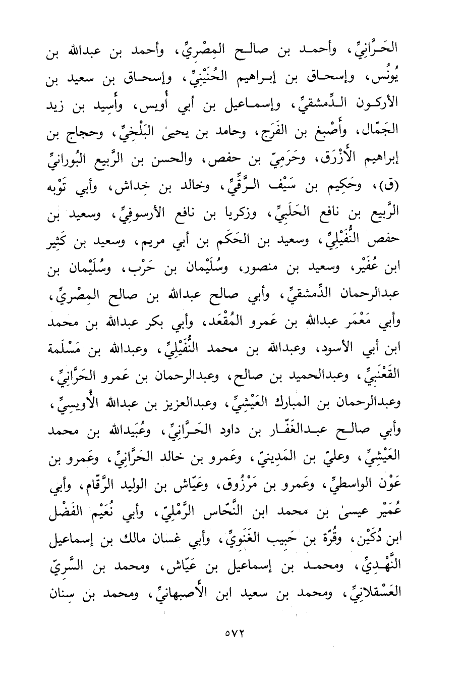 الحراني، وأحمد بْن صَالِحٍ المصري، وأَحْمَد بْن عَبد اللَّهِ بْن يونس، وإسحاق بن إبراهيم الحنيني، وإسحاق بن سَعِيد بن الا ركون الدمشقي، وإسماعيل بن أَبي أويس، وأسيد بن زيد الجمال، وأصبغ بن الفرج، وحامد بن يحيى البلخي، وحجاج بن إبراهيم الأزرق، وحرمي بْن حفص، والحسن بْن الربيع البوراني (ق) ، وحكيم بن سيف الرَّقِّيّ، وخالد بن خداش، وأبي توبة الربيع بْن نَافِع الحلبي، وزكريا بن نافع الأرسوفي، وسَعِيد بن حفص النفيلي، وسَعِيد بْن الحكم بْن أَبي مريم، وسَعِيد بن كثير ابن عفير، وسَعِيد بْن مَنْصُور، وسُلَيْمان بن حرب، وسُلَيْمان بن عبد الرَّحْمَنِ الدمشقي، وأبي صالح عَبد اللَّهِ بن صالح المِصْرِي، وأبي مَعْمَر عَبد اللَّهِ بْن عَمْرو المقعد، وأَبِي بَكْرٍ عَبد اللَّهِ بن محمد ابن أَبي الأسود، وعَبد اللَّهِ بن مُحَمَّد النفيلي، وعَبد اللَّه بْن مسلمة القعنبي، وعبد الحميد بْن صالح، وعَبْد الرَّحْمَنِ بن عَمْرو الحراني، وعَبْد الرَّحْمَنِ بن المبارك العيشي، وعبد العزيز بن عَبد اللَّه الأُوَيسي، وأبي صالح عبد الغفار بْن داود الحراني، وعُبَيد اللَّه بْن مُحَمَّد العيشي، وعلي بن المديني، وعَمْرو بن خالد الحراني وعَمْرو بْن عون الواسطي، وعَمْرو بن مرزوق، وعياش بن الوليد الرقام، وأبي عُمَير عيسى بن محمد ابن النحاس الرملي، وأبي نعيم الفضل ابن دكين، وقرة بن حبيب الغنوي، وأبي غسان مَالِك بْن إِسْمَاعِيل النهدي، ومُحَمَّد بْن إِسْمَاعِيل بْن عياش، ومحمد بن السري العسقلاني، ومحمد بن سَعِيد ابن الأصبهاني، ومحمد بن سنان