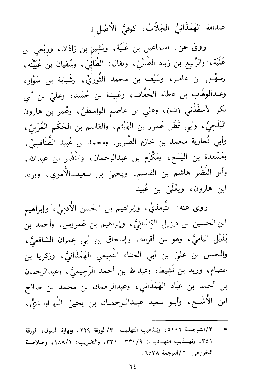 = 3 / الترجمة 5106، وتذهيب التهذيب: 3 / الورقة 229، ونهاية السول، الورقة 341، وتهذيب التهذيب: 9 / 330 - 331، والتقريب: 2 / 188، وخلاصة الخزرجي: 2 / الترجمة 6478.
