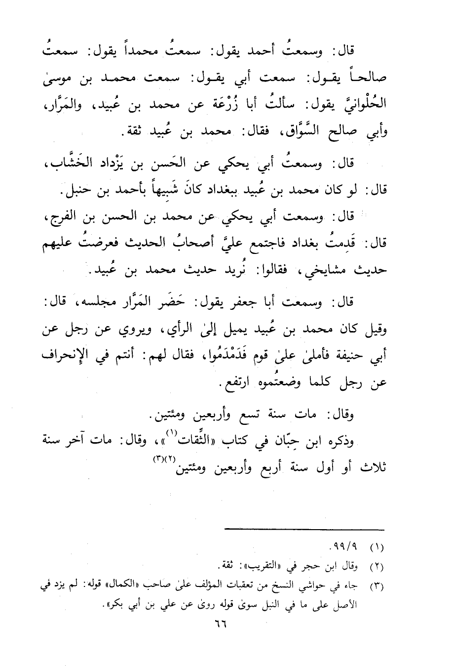 قال: وسمعت أَحْمَد يقول: سمعت محمدا يقول: سمعت صالحا يقول: سمعت أبي يقول: سمعت مُحَمَّد بن مُوسَى الحلواني يقول: سألت أبا زرعة عن مُحَمَّد بن عُبَيد، والمرار، وأبي صالح السواق، فقال: مُحَمَّد بن عُبَيد ثقة.