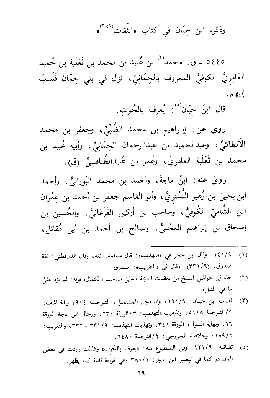 5445 - ق: مُحَمَّد بن عُبَيد بن مُحَمَّد بن ثعلبة بن حميد العامري الكوفي المعروف بالحماني (3) ، نزل في بني حمان فنسب إليهم.