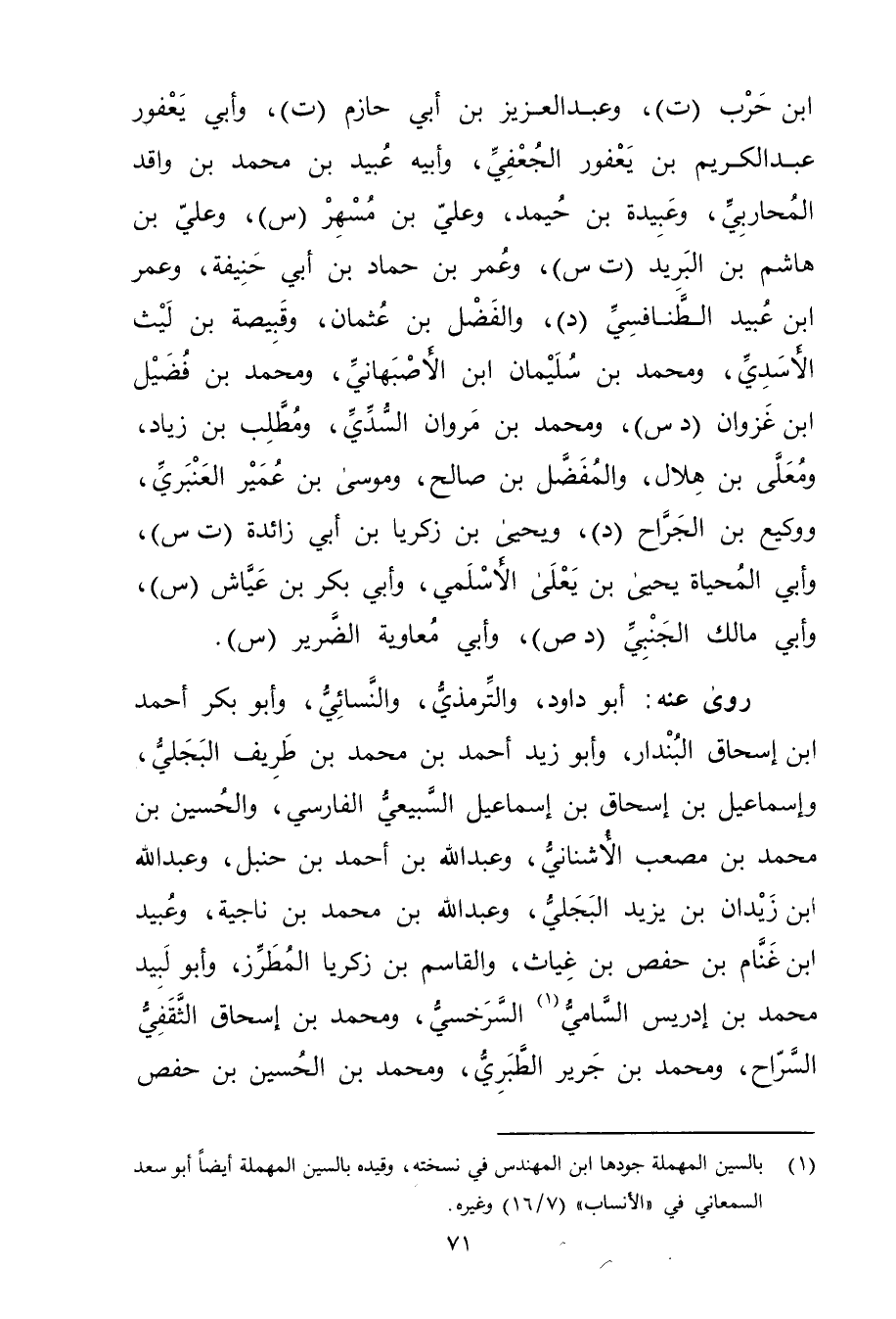 (1) بالسين المهملة جودها ابن المهندس في نسخته، وقيده بالسين المهملة أيضا أبو سعد السمعاني في (الانساب) (7 / 16) وغيره.