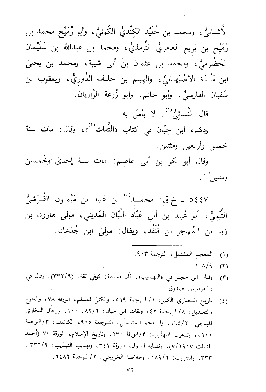(4) تاريخ البخاري الكبير: 1 / الترجمة 519، والكنى لمسلم، الورقة 78، والجرح والتعديل: 8 / الترجمة 42، وثقات ابن حبان: 9 / 82، 100، ورجال البخاري للباجي: 2 / 664، والمعجم المشتمل، الترجمة 905، الكاشف: 3 / الترجمة 5110، وتذهيب التهذيب: 3 / الورقة 230، وتاريخ الاسلام، الورقة 70 (أحمد الثالث 2917 / 7) ، ونهاية السول، الورقة 341، وتهذ يب التهذيب: 9 / 332 - 333، والتقريب: 2 / 189. وخلاصة الخزرجي: 2 / الترجمة 6482.