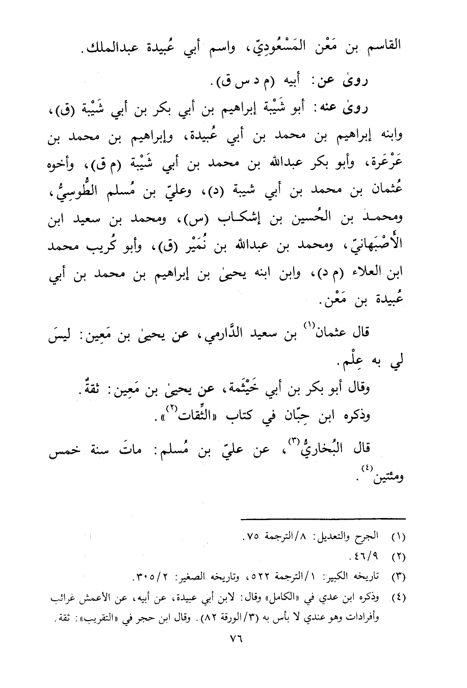 (4) وذكره ابن عدى في (الكامل) وَقَال: لابن أبى عُبَيدة، عَن أبيه، عن الأعمش غرائب وأفرادات وهُوَ عندي لا بأس به (3 / الورقة 82) . وَقَال ابن حجر في (التقريب) : ثقة.