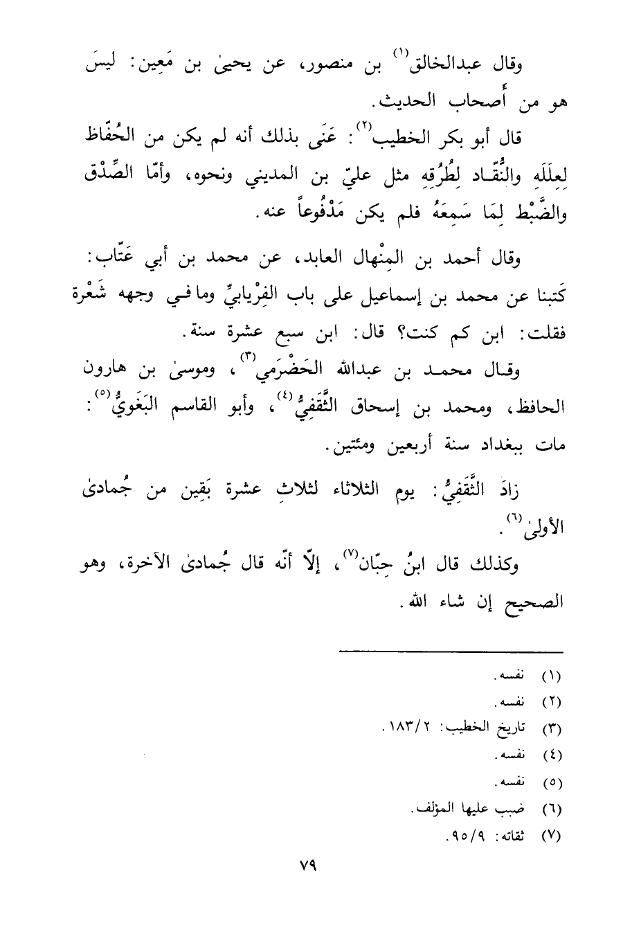 وَقَال مُحَمَّد بْن عَبد الله الحضرمي (3) ، وموسى بن هَارُونَ الحافظ، ومحمد بن إسحاق الثقفي (4) ، وأَبُو القاسم البغوي (5) : مات ببغداد سنة أربعين ومئتين.