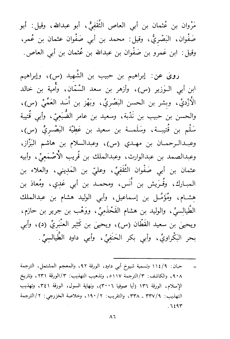 = حبان: 9 / 114 وتسمية شيوخ أبي داود، الورقة 92، والمعجم المشتمل، الترجمة 908، والكاشف: 3 / الترجمة 5117، وتذهيب التهذيب: 3 / الورقة 231، وتاريخ الاسلام، الورقة 136، (أيا صوفيا 3006) ، ونهاية السول، الورقة 341، وتهذيب التهذيب: 9 / 337 - 338، والتقريب: 2 / 190، وخلاصة الخزرجي: 2 / الترجمة 6493.