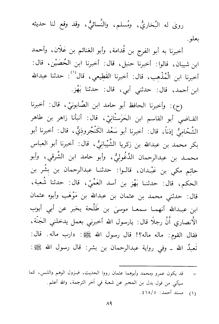أخبرنا بِهِ أَبُو الْفَرَجِ بْنُ قُدَامَةَ، وأبو الغنائم بْن علان، وأحمد بْنُ شَيْبَانَ، قَالُوا: أَخْبَرَنَا حَنْبَلُ، قال: أخبرنا ابن الحصين، قال: أخبرنا ابْنُ الْمُذْهِب، قال: أخبرنا القَطِيعِيّ، قال (1) : حَدَّثَنَا عَبد الله بْن أَحْمَدَ قال: حَدَّثني أبي، قال: حَدَّثَنَا بَهْزٌ.