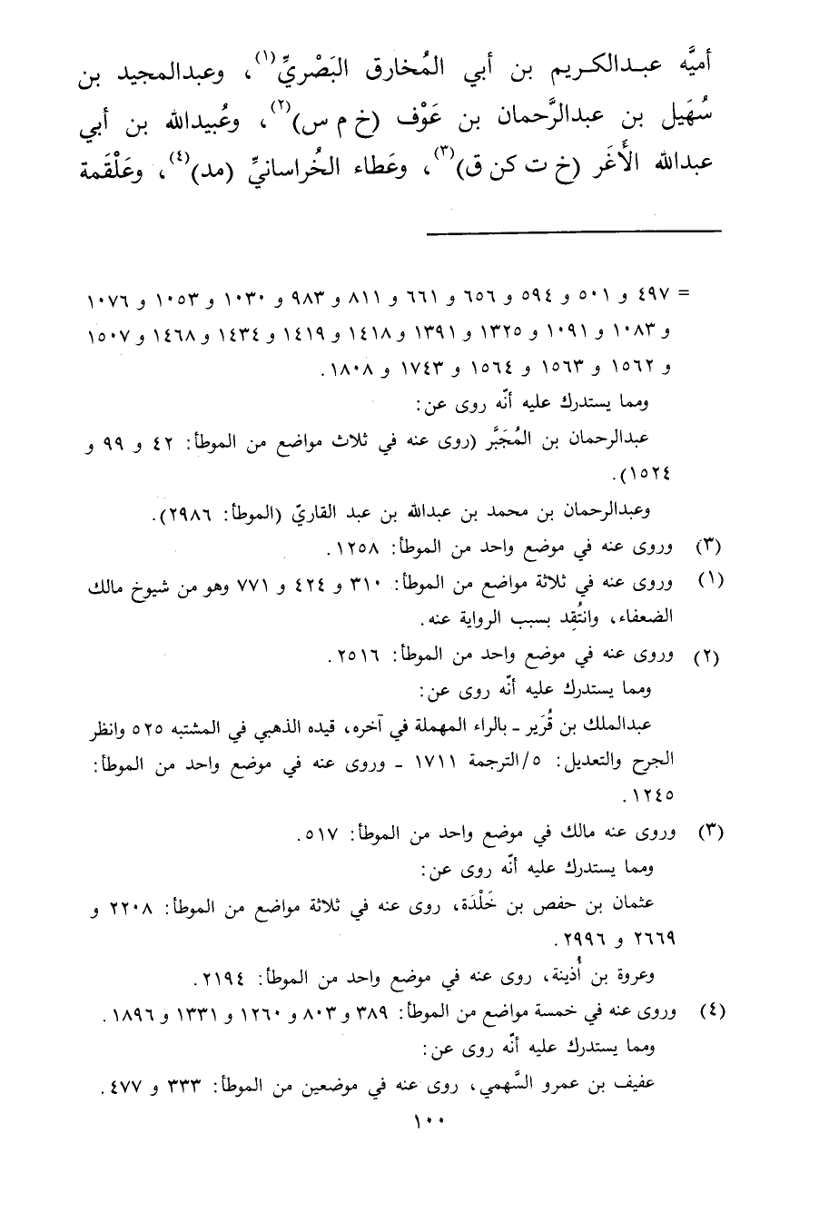 عَبْد الرحمن بْن المجبر (روى عنه في ثلاث مواضع من الموطأ: 42 و99 و1524) .