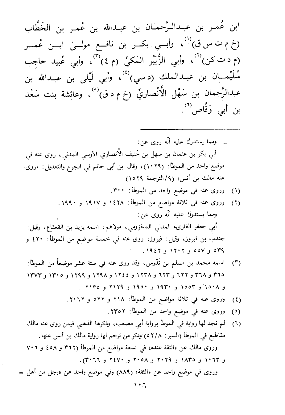 (6) لم نجد لها رواية في الموطأ برواية أبي مصعب، وذكرها الذهبي فيمن روى عنه مالك مقاطيع في الموطأ (السير: 8 / 52) وذكر من ترجم لها رواية مالك بن أنس عنها.
