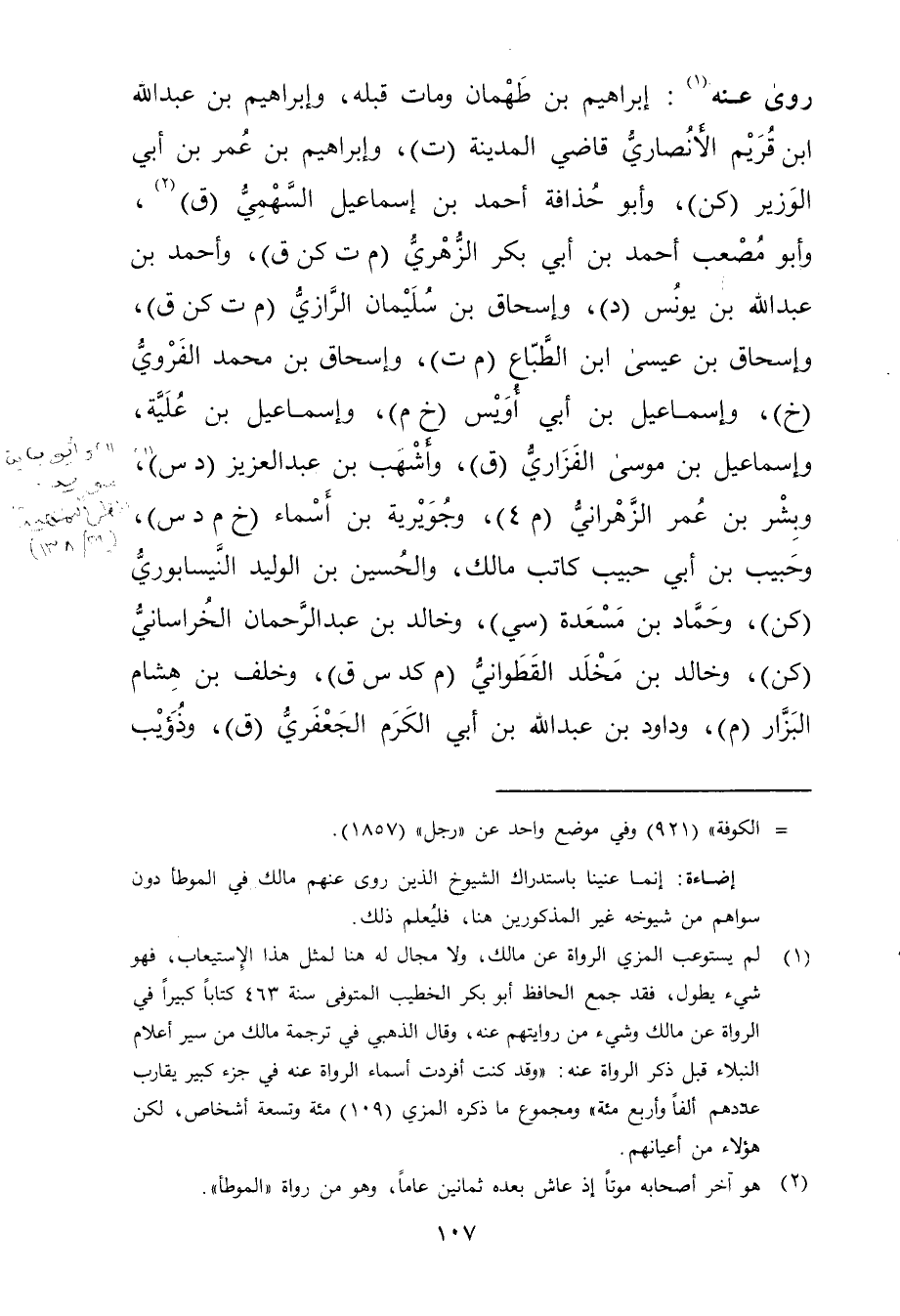 (1) لم يستوعب المزي الرواة عن مالك، ولا مجال له هنا لمثل هذا الاستيعاب، فهو شيء يطول، فقد جمع الحافظ أبو بكر الخطيب المتوفى سنة 463 كتابا كبيرا في الرواة عن مالك وشئ من روايتهم عنه، وَقَال الذهبي في ترجمة مالك من سير أعلام النبلاء قبل ذكر الرواة عَنه: "وقد كنت أفردت أسماء الرواة عنه في جزء كبير يقارب عددهم ألفا وأربع مئة "ومجموع ما ذكره المزي (109) مئة وتسعة أشخاص، لكن هؤلاء من أعيانهم.