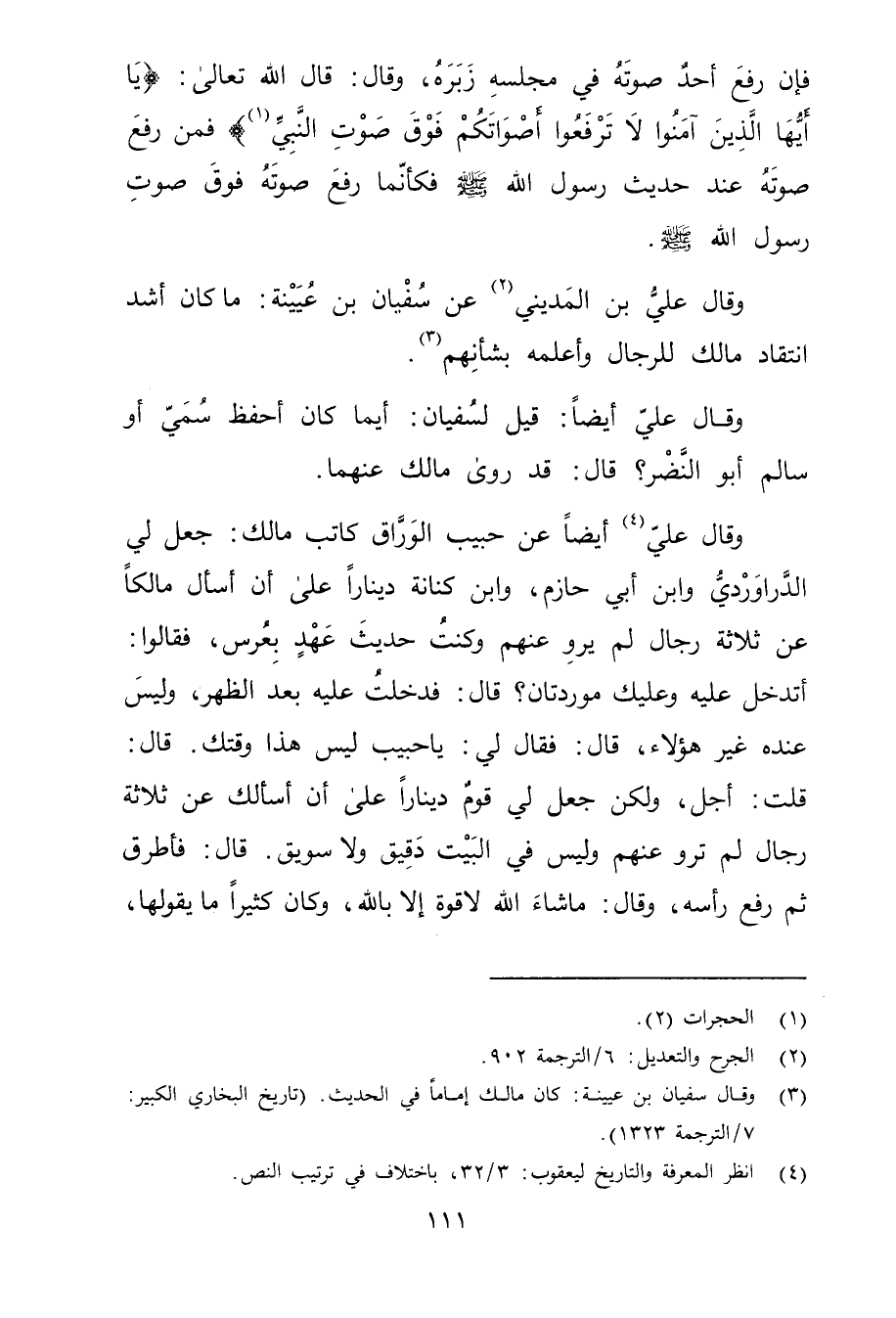 وَقَال علي بْن المديني (2) عَن سفيان بْن عُيَيْنَة: ما كان أشد انتقاد مالك للرجال وأعلمه بشأنهم (3) .