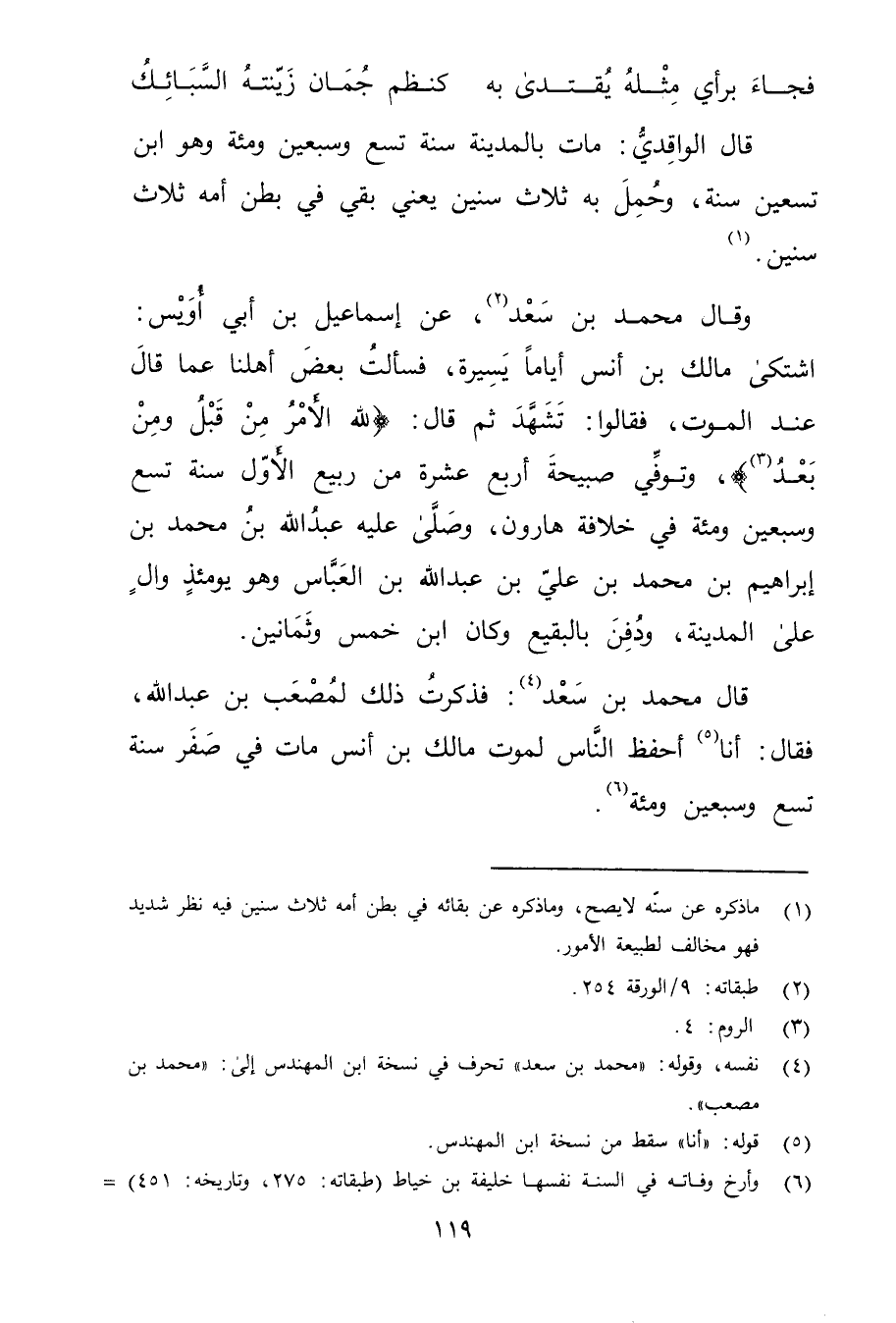 قال مُحَمَّد بْن سعد (4) : فذكرت ذلك لمصعب بْن عَبد الله، فقال: أنا (5) أحفظ الناس لموت مالك بْن أنس مات في صفر سنة تسع وسبعين ومئة (6) .