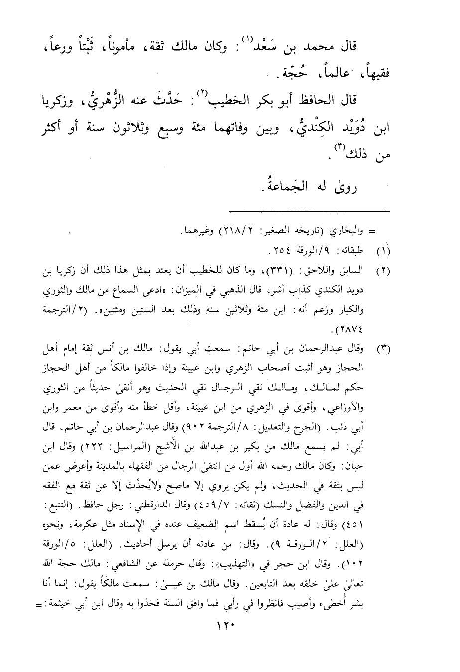 (3) وَقَال عبد الرحمن بن أَبي حاتم: سمعت أبي يقول: مالك بن أنس ثقة إمام أهل
