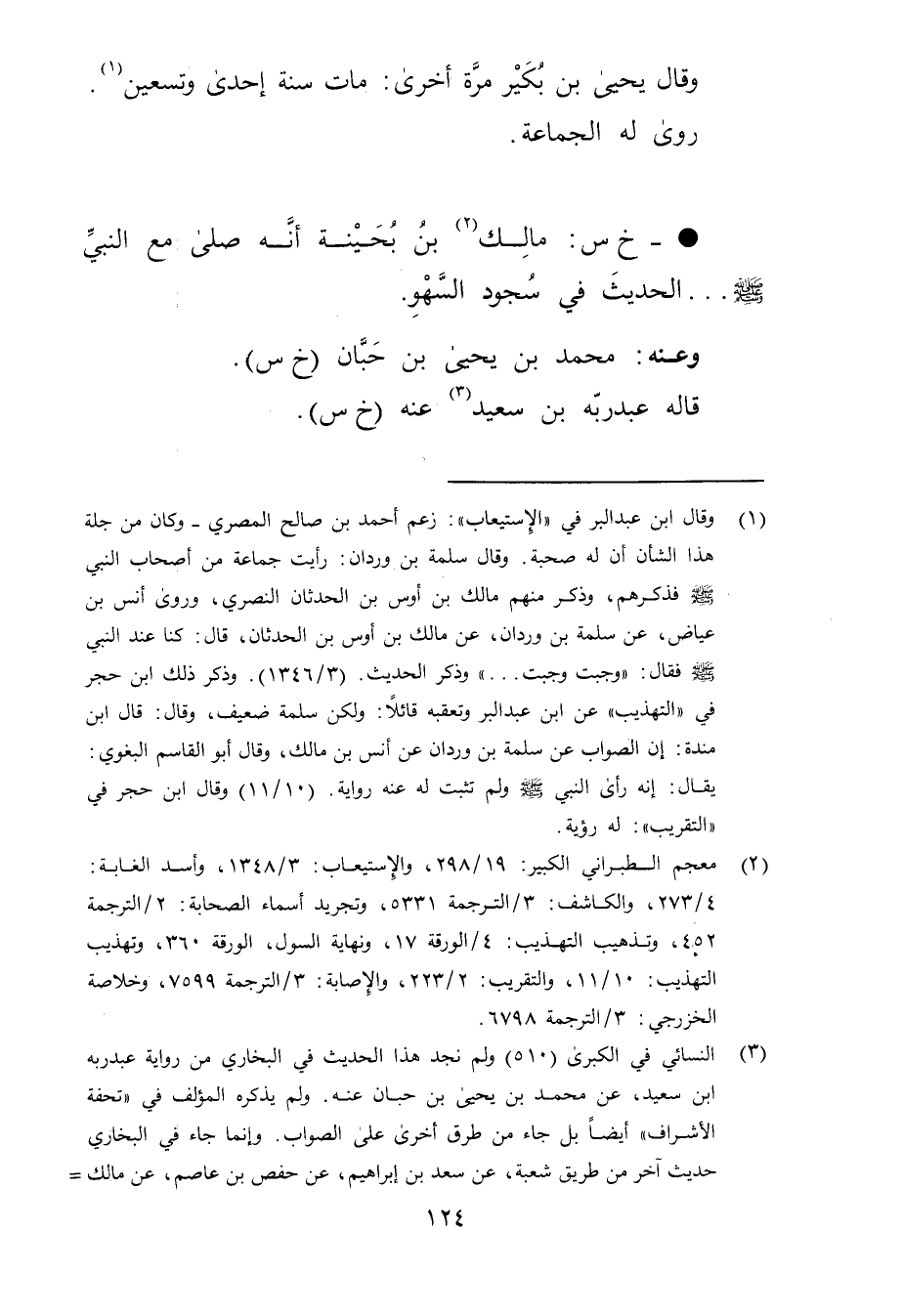 • خ س: مالك (2) بن بحينة أنه صلى مع النبي صَلَّى اللَّهُ عَلَيْهِ وسَلَّمَ ... الحديث في سجود السهو.