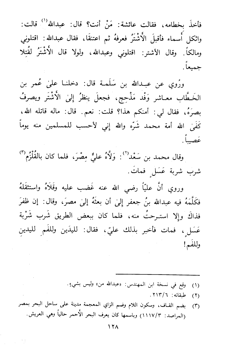 وَقَال مُحَمَّد بْن سعد (2) : ولاه على مصر، فلما كان بالقلزم (3) شرب شربة عسل فمات.