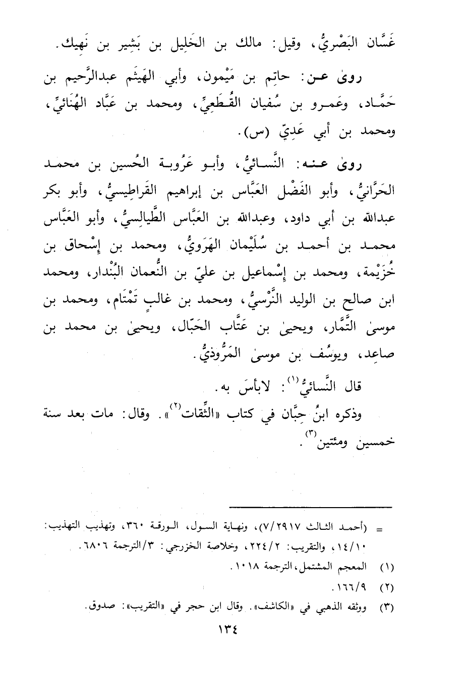 رَوَى عَن: حاتم بْن ميمون، وأبي الهيثم عَبد الرحيم بْن حماد، وعَمْرو بْن سفيان القطعي، ومحمد بْن عباد الهنائي، ومحمد بْن أَبي عدي (س) .