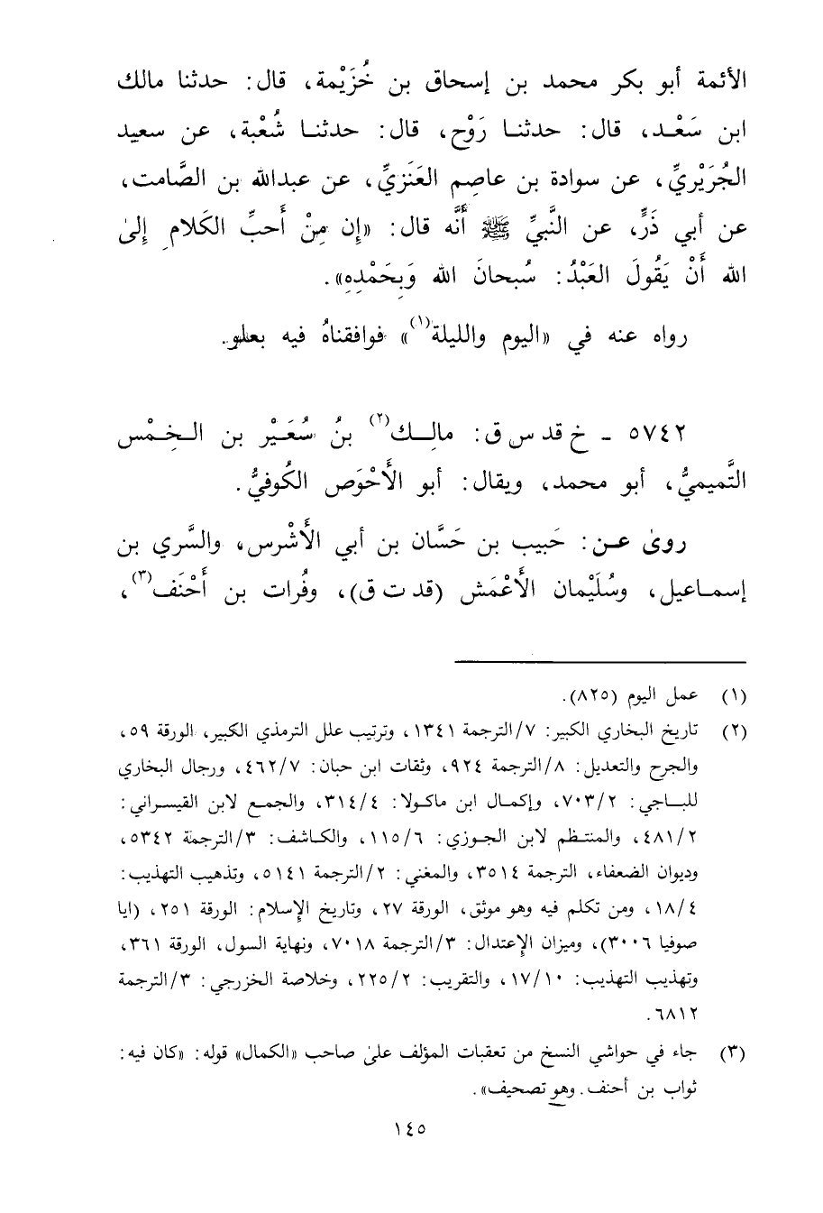 الأَئِمَّةِ أَبُو بَكْرٍ مُحَمَّدُ بْنُ إِسْحَاقَ بْنِ خُزَيْمَةَ، قال: حَدَّثَنَا مالك ابن سَعْدٍ، قال: حَدَّثَنَا رَوْحٌ، قال: حَدَّثَنَا شُعْبَةُ، عَنْ سَعِيد الْجُرَيْرِيِّ، عَنْ سَوادَةَ بْنِ عَاصِمٍ الْعَنْزِيِّ، عَنْ عَبد اللَّهِ بْنِ الصَّامِتِ، عَن أَبِي ذَرٍّ، عَنِ النَّبِيِّ صَلَّى اللَّهُ عَلَيْهِ وسَلَّمَ إنه قال: إِنَّ مِنْ أَحَبِّ الْكَلامِ إِلَى اللَّهِ أَنْ يَقُولَ الْعَبْدُ: سُبْحَانَ اللَّهِ وبِحَمْدِهِ.