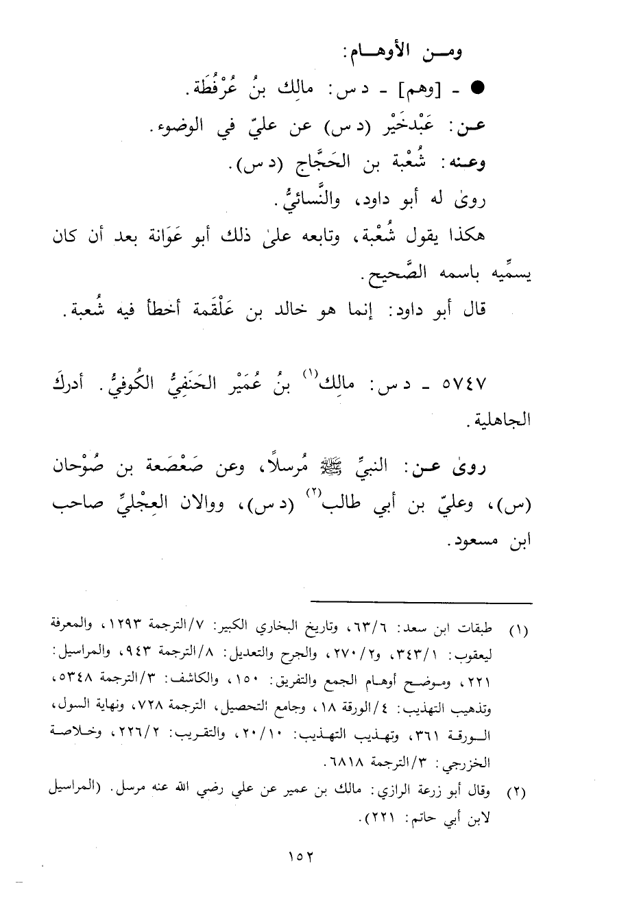 (2) وَقَال أبو زُرْعَة الرازي: مالك بن عُمَير عن علي رضي الله عنه مرسل. (المراسيل لابن أَبي حاتم: 221) .