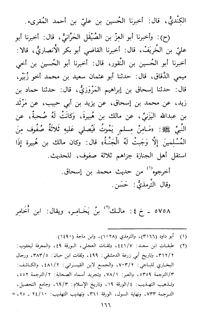 (ح) : وأَخْبَرَنَا أَبُو العز بْن الصيقل الحراني، قال: أَخْبَرَنَا أَبُو علي بْنِ الْخَرِيفِ، قال: أَخْبَرَنَا الْقَاضِي أَبُو بَكْرٍ الأَنْصارِيّ، قَالا: أَخْبَرَنَا أَبُو الحسين بْن النقور، قال: أخبرنا أبو الحسين بن أَخِي مِيمِي الدَّقَّاقُ، قال: حَدَّثَنَا أَبُو عثمان سَعِيد بن مُحَمَّد أخو زبير، قال: حدثمنا إسحاق بْن إِبْرَاهِيم المروزي، قال: حَدَّثَنَا حماد بْن زيد، عَن مُحَمَّدُ بْنُ إِسْحَاقَ، عَنْ يَزِيدَ بْنِ أَبي حَبِيبٍ، عَنْ مَرْثَدِ بْنِ عَبد اللَّهِ الْيَزَنِيِّ، عَنْ مَالِكِ بْنِ هُبَيْرَةَ، وكَانَتْ لهُ صُحبَةٌ، عَنِ النَّبِيِّ صَلَّى اللَّهُ عليه وسلم: "مامن مُسْلِمٍ يَمُوتُ فَيُصَلِّي عَلَيْهِ ثَلاثَةُ صُفُوفٍ مِنَ الْمُسْلِمِينَ إِلا وجَبَتْ لَهُ الْجَنَّةُ "قال: وكَانَ مَالِكُ بْنُ هُبَيْرَةَ إِذَا اسْتَقَلَّ أَهْلَ الْجَنَازَةِ جَزَّأَهُمْ ثَلاثَةَ صُفُوفٍ، لِلْحَدِيثِ.