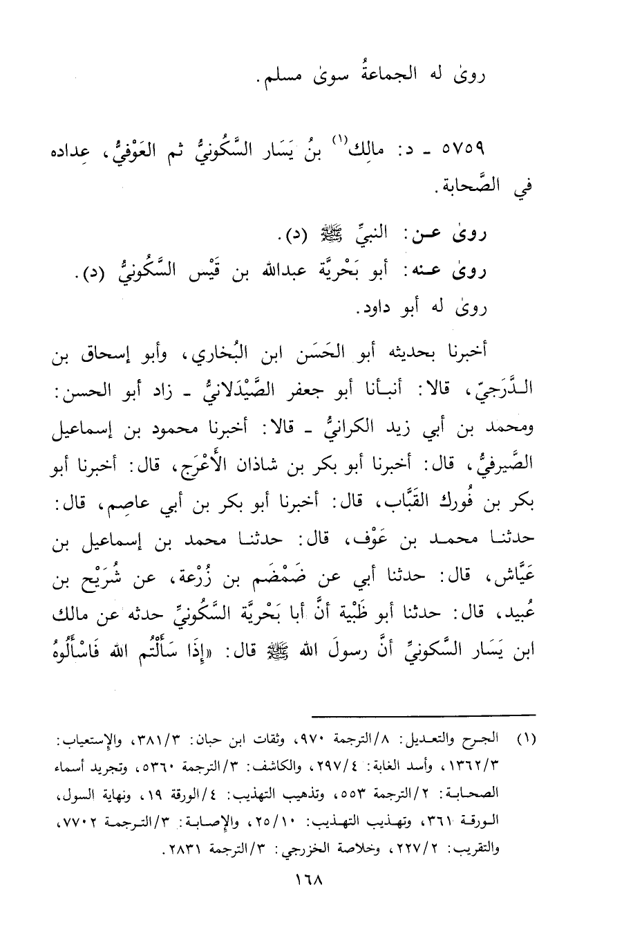 5759 - د: مالك بن يسار السكوني ثم العوفي (1) ، عداده في الصحابة.