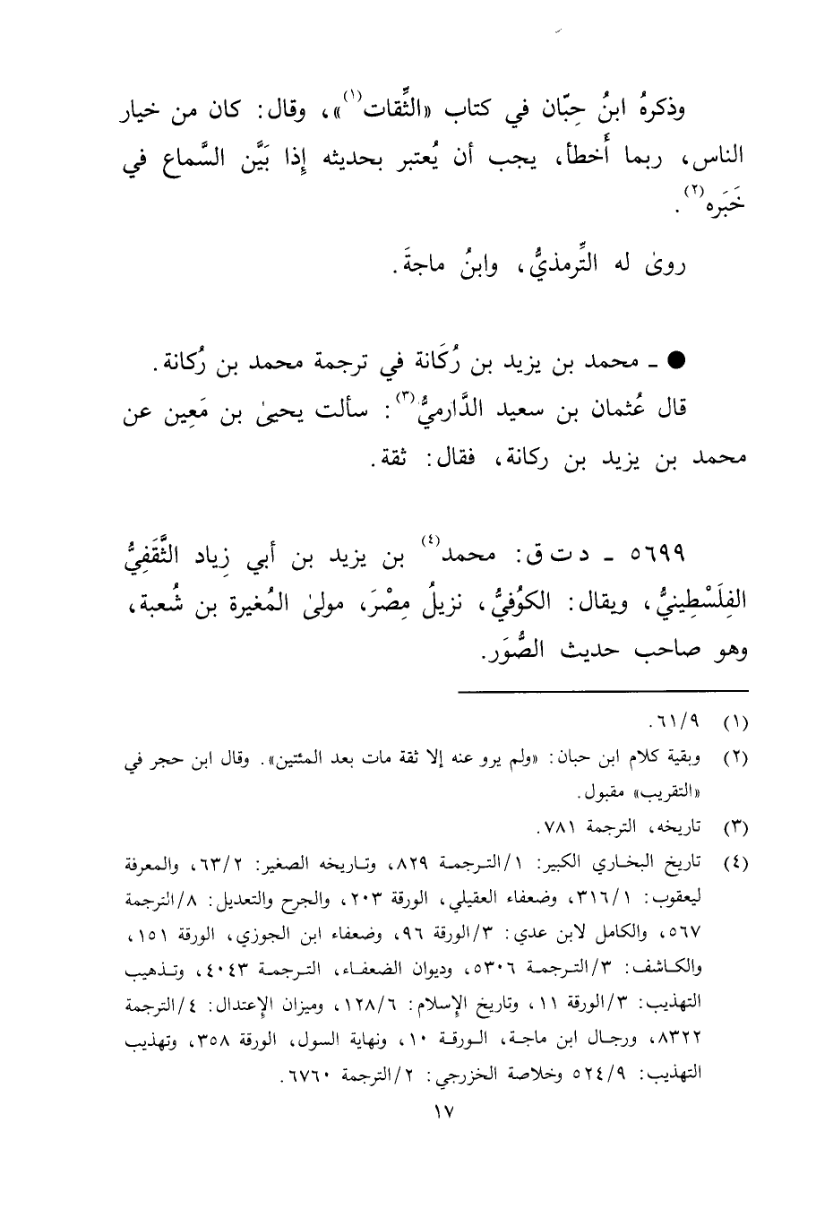 (4) تاريخ البخاري الكبير: 1 / الترجمة 829، وتاريخه الصغير: 2 / 63، والمعرفة ليعقوب: 1 / 316، وضعفاء العقيلي، الورقة 203، والجرح والتعديل: 8 / الترجمة 567، والكامل لابن عدي: 3 / الورقة 96، وضعفاء ابن الجوزي، الورقة 151، والكاشف: 3 / الترجمة 5306، وديوان الضعفاء، الترجمة 4043، وتذهيب التهذيب: 3 / الورقة 11، وتاريخ الاسلام: 6 / 128، وميزان الاعتدال: 4 / الترجمة 8322، ورجال ابن ماجة، الورقة 10، ونهاية السول، الورقة 358، وتهذيب التهذيب: 9 / 524 وخلاصة الخزرجي: 2 / الترجمة 6760.