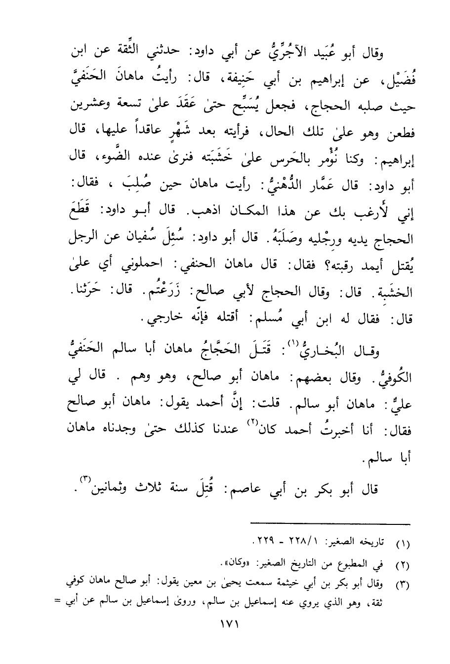 وَقَال أَبُو عُبَيد الأجري عَن أبي داود: حَدَّثَنِي الثقة عَنِ ابن فضيل، عَنِ إبراهيم بْن أَبي حنيفة، قال: رأيت ماهان الحنفي حيث صلبه الحجاج، فجعل يسبح حتى عقد على تسعة وعشرين فطعَنْ وهو على تلك الحال، فرأيته بعد شهر عاقدا عليها، قال إبراهيم: وكنا نومر بالحرس على خشبته فنرى عَنْده الضوء، قال أَبُو داود: قال عمار الدهني: رأيت ماهان حين صلب، فقال: إني لأرغب بك عَنْ هذا المكان اذهب. قال أَبُو داود: قطع الحجاج يديه ورجليه وصلبه. قال أَبُو داود: سئل سفيان عَنِ الرجل يقتل أيمد رقبته؟ فقال: قال ماهان الحنفي: احملوني أي على الخشبة. قال: وَقَال الحجاج لأبي صالح: زرعتم. قال: حرثنا. قال: فقال له ابن أَبي مسلم: اقتله فإنه خارجي.
