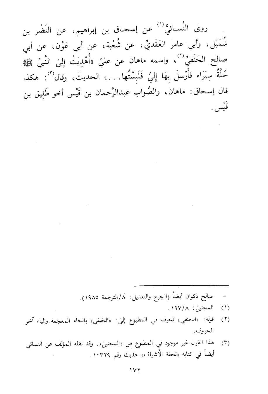 روى النَّسَائي (1) عَنِ إسحاق بْن إبراهيم، عَنِ النضر بْن شميل، وأبي عامر العقدي، عَنْ شُعْبَة، عَن أبي عون، عَن أبي صالح الحنفي (2) ، واسمه ماهان عَنْ علي "أهديت إلى النبي صَلَّى اللَّهُ عَلَيْهِ وسَلَّمَ حُلَّةٌ سِيَرَاءُ فأرسل بها إلي فلبستها ... "الحديث، وَقَال (3) : هكذا قال إسحاق: ماهان، والصواب عَبْد الرَّحْمَن بْن قيس أخو طليق بن قيس.