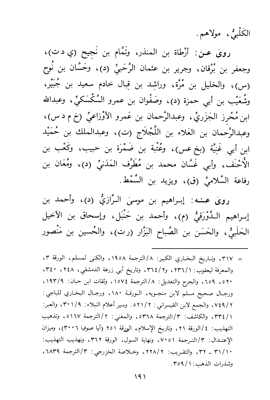 = 317، وتاريخ البخاري الكبير: 8 / الترجمة 1958، والكنى لمسلم، الورقة 3، والمعرفة ليعقوب: 1 / 236، و2 / 364، وتاريخ أبي زرعة الدمشقي، 248، 340، 520، 659، والجرح والتعديل: 8 / الترجمة 1574، وثقات ابن حبان: 9 / 193، ورجال صحيح مسلم لابن منجويه، الورقة 180، ورجال البخاري للباجي: 2 / 749، والجمع لابن القيسراني: 2 / 521. وسير أعلام النبلاء: 9 / 301، والعبر: 1 / 334، والكاشف: 3 / الترجمة 5368، والمغني: 2 / الترجمة 5167، وتذهيب التهذيب: 4 / الورقة 21، وتاريخ الاسلام، الورقة 251 (أيا صوفيا 3006) ، وميزان الاعتدال: 3 / الترجمة 7051، ونهاية السول، الورقة 362، وتهذيب التهذيب: 10 / 31 - 32، والتقريب: 2 / 228، وخلاصة الخزرجي: 3 / الترجمة 6839،