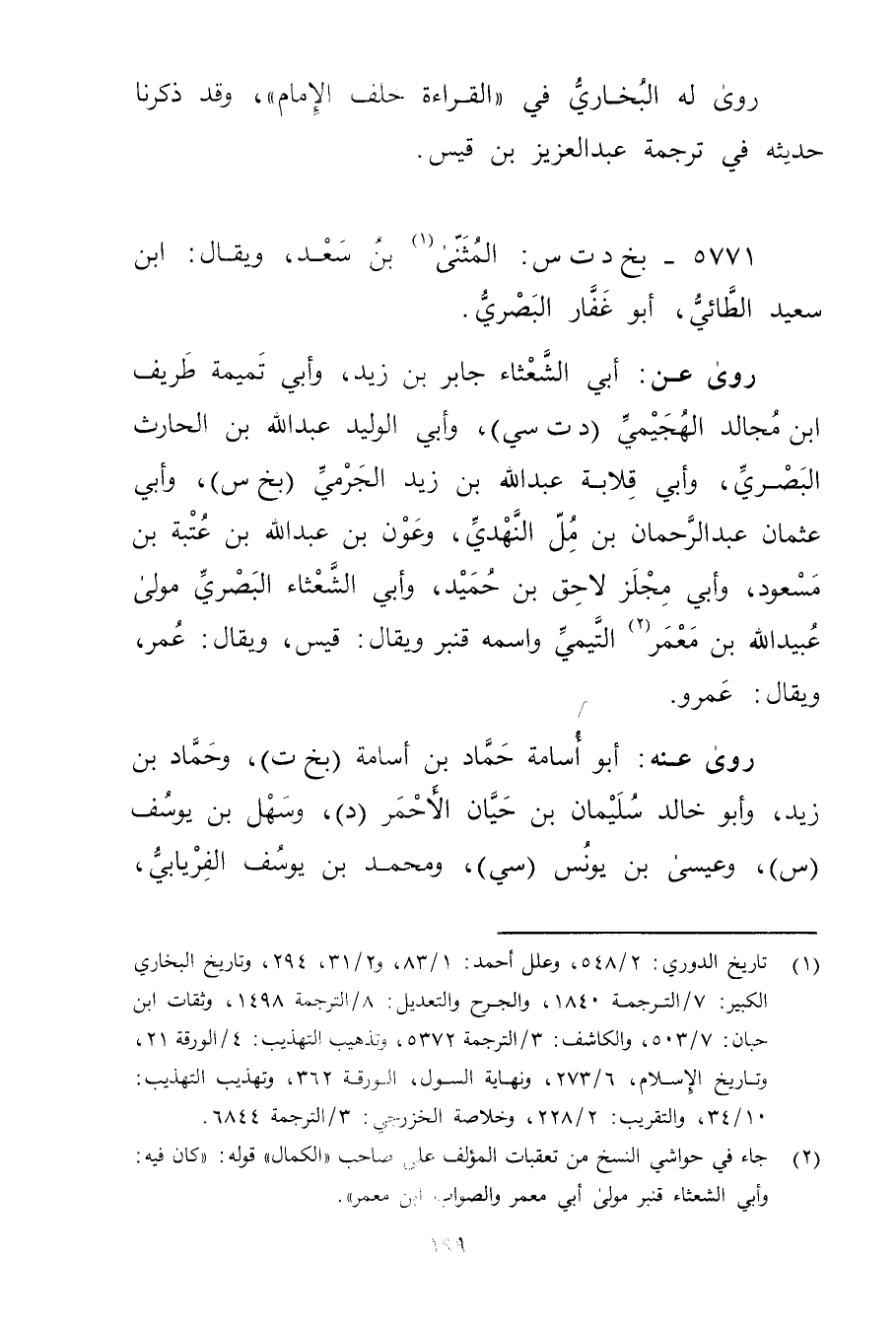 5771 - بخ د ت س: المثنى بن سعد (1) ، ويُقال: ابن سَعِيد الطائي، أَبُو غفار البَصْرِيّ.