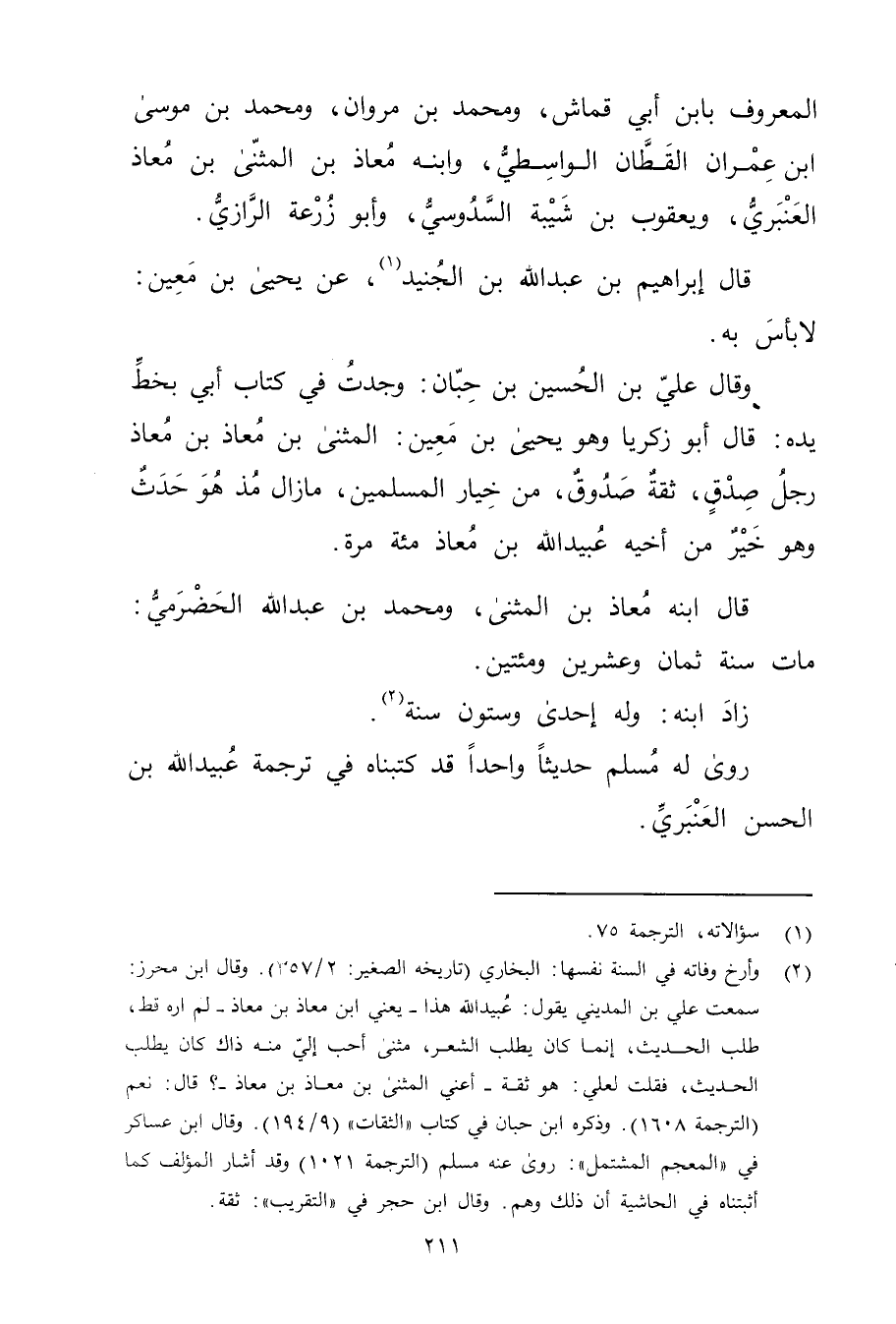 (2) وأرخ وفاته في السنة نفسها: البخاري (تاريخه الصغير: 2 / 357) . وَقَال ابن محرز: سمعت علي بْن المديني يَقُول: عُبَيد الله هذا، يعني ابن معاذ بن معاذ - لم اره قط، طلب الحديث، إنما كان يطلب الشعر، مثنى أحب إلي منه ذاك كان يطلب الحديث، فقلت لعلي: هو ثقة - أعني المثنى بْن معاذ بْن معاذ -؟ قال: نعم (الترجمة 1608) ، وذَكَره ابنُ حِبَّان في كتاب "الثقات" (9 / 194) . وَقَال ابن عساكر في "المعجم المشتمل ": روى عنه مسلم (الترجمة 1021) وقد أشار المؤلف كما أثبتناه في الحاشية أن ذلك وهم. وَقَال ابن حجر في "التقريب": ثقة.
