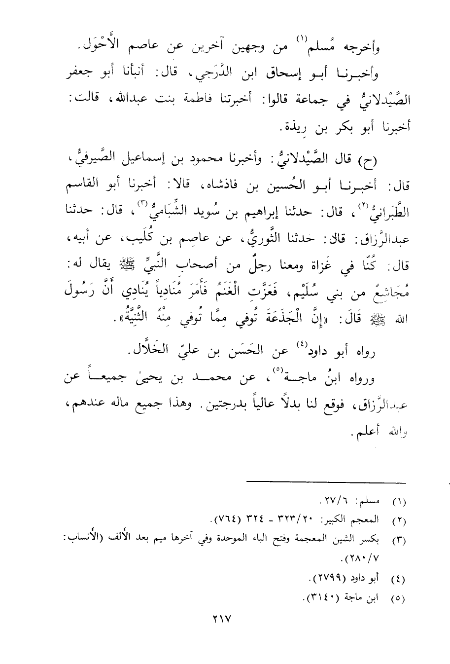 (ح) قال الصيدلاني: وأخبرنا مَحْمُودُ بْنُ إِسْمَاعِيلَ الصَّيْرَفِيُّ، قال: أخبرنا أَبُو الحسين بْن فَاذشَاهِ، قَالا: أخبرنا أَبُو الْقَاسِمِ الطَّبَرَانِيِّ (2) ، قال: حَدَّثَنَا إِبْرَاهِيمُ بْنُ سويد الشبامي (3) ، قال: حَدَّثَنَا عبد الزراق: قال: حَدَّثَنَا الثَّوْرِيُّ، عَنْ عَاصِمِ بْنِ كُلَيْبٍ، عَن أَبِيهِ، قال: كُنَّا فِي غَزَاةٍ ومَعَنْا رَجُلٌ من أصحاب النَّبِيّ صَلَّى اللَّهُ عَلَيْهِ وسَلَّمَ يُقَالُ لَهُ: مُجَاشِعٌ مِنْ بَنِي سُلَيْمٍ، فَعَزَّتِ الْغَنَمُ فَأَمَرَ مُنَادِيًا يُنَادِي أَنَّ رَسُولَ اللَّهِ صلى الله عليه وسلم قال: إِنَّ الْجَذَعَةَ تُوفِي مِمَّا تُوفِي مِنْهُ الثِّنِيَّةُ.