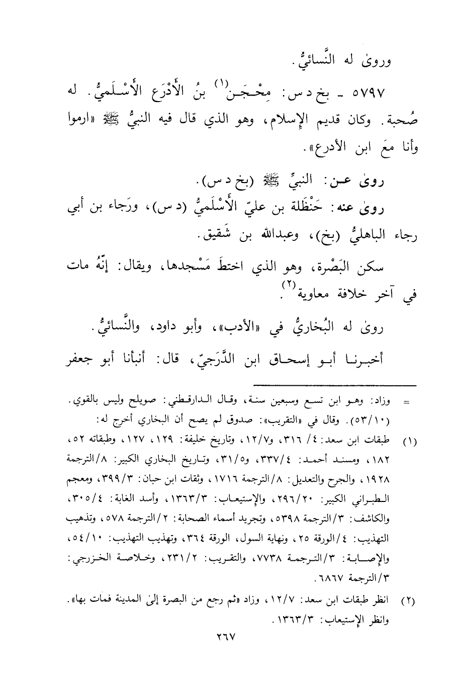 5797 - بخ د س: محجن بن الأدرع الأَسلميّ (1) . له صحبة. وكان قديم الإسلام، وهو الذي قال فيه النَّبِيّ صَلَّى اللَّهُ عليه وسلم "إرموا وأنا مع ابْن الأدرع.