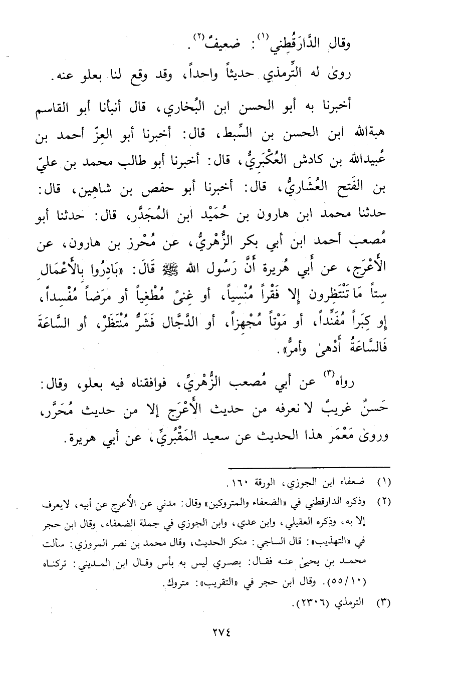 أَخْبَرَنَا بِهِ أبو الحسن بْن البخاري، قال أَنْبَأَنَا أَبُو الْقَاسِمِ هِبَةُ اللَّهِ بْنُ الْحَسَنِ بْنِ السِّبْطِ، قال: أَخْبَرَنَا أَبُو الْعِزِّ أَحْمَدُ بْنُ عُبَيد اللَّهِ بْنِ كَادِشَ الْعُكْبَرِيُّ، قال: أخبرنا أَبُو طالب مُحَمَّد بن علي بن الفتح العشاري، قال: أَخْبَرَنَا أبو حفص بْن شاهين، قال: حَدَّثَنَا محمد ابن هارون بْن حميد بْن المجدر، قال: حَدَّثَنَا أَبُو مُصْعَبٍ أَحْمَدُ بْنُ أَبي بَكْرٍ الزُّهْرِيّ، عَنْ مُحْرِزِ بْنِ هَارُونَ، عَنِ الأَعْرَجِ، عَن أَبِي هُرَيْرة أَنَّ رَسُولَ اللَّهِ صلى الله عليه وسلم قال: بَادِرُوا بِالأَعْمَالِ سِتًّا مَا تَنْتَظِرُونَ إِلا فَقْرًا مُنْسِيًا، أَوْ غِنَىً مُطْغِيًا أَوْ مَرَضًا مُفْسِدًا، أَوْ كِبَرًا مُفَنِدًا، أَوْ مَوْتًا مُجْهِزًا، أَوِ الدَّجَّالِ فَشَرٌّ مُنْتَظَرٌ، أَوِ السَّاعَةُ فَالسَّاعَةُ أَدْهَى وأَمَرُّ.