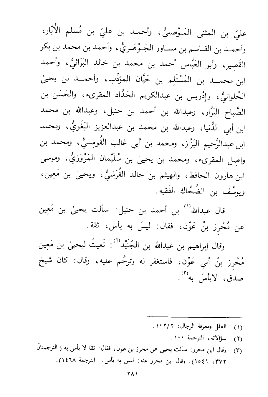 (3) وَقَال ابن محرز: سألت يحيى عَنْ محرز بْن عون، فقال: ثقة لا بأس به (الترجمتان 372، 1541) . وَقَال ابن محرز عَنه: ليس به بأس. الترجمة 1468) .
