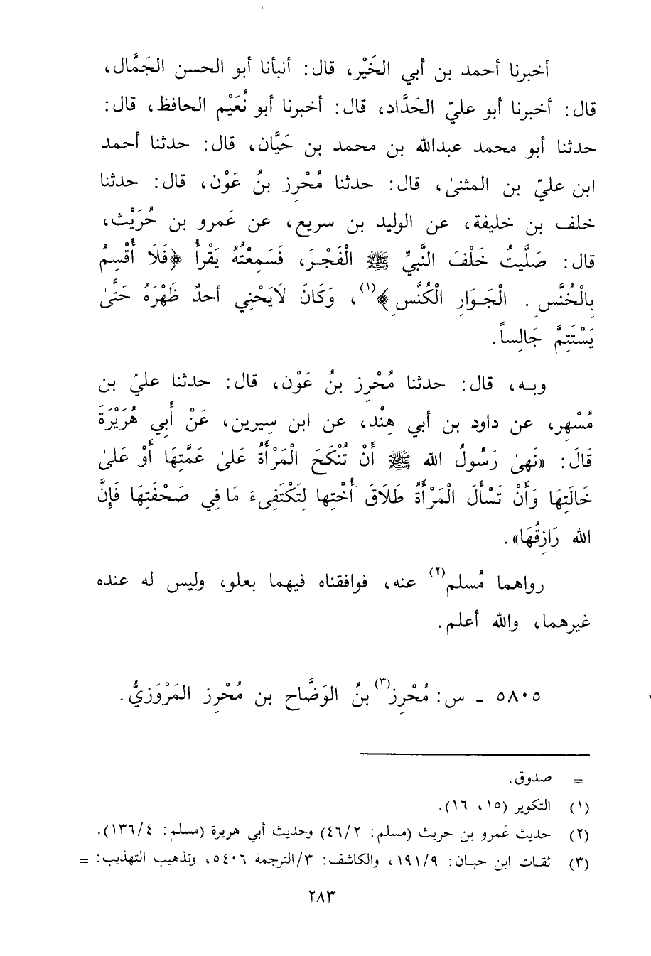 أَخْبَرَنَا أَحْمَد بْن أَبي الخير، قال: أَنْبَأَنَا أَبُو الْحَسَنِ الْجَمَّالُ، قال: أَخْبَرَنَا أَبُو عَلِيّ الحداد، قال: أَخْبَرَنَا أَبُو نُعَيْمٍ الْحَافِظُ، قال: حَدَّثَنَا أَبُو مُحَمَّد عَبد اللَّهِ بْن مُحَمَّد بْن حيان، قال: حَدَّثَنَا أَحْمَدُ بْنُ عَلِيٍّ بْنِ الْمُثَنَّى، قال: حَدَّثَنَا مُحْرِزُ بْنُ عَوْنٍ، قال: حَدَّثَنَا خَلَفُ بْنُ خَلِيفَةَ، عَنِ الْوَلِيدِ بْنِ سَرِيعٍ، عَنْ عَمْرو بْنِ حُرَيْثٍ، قال: صَلَّيْتُ خَلْفَ النَّبِيِّ صلى اللَّهُ عَلَيْهِ وسَلَّمَ الْفَجْرَ، فَسَمِعْتُهُ يَقْرَأُ {فَلا أُقْسِمُ بِالْخُنَّسِ. الْجَوَارِ الْكُنَّسِ) {1) ، وكَانَ لا يَحْنِي أَحَدٌ ظَهْرَهُ حَتَّى يَسْتَتَمَّ جَالِسًا.