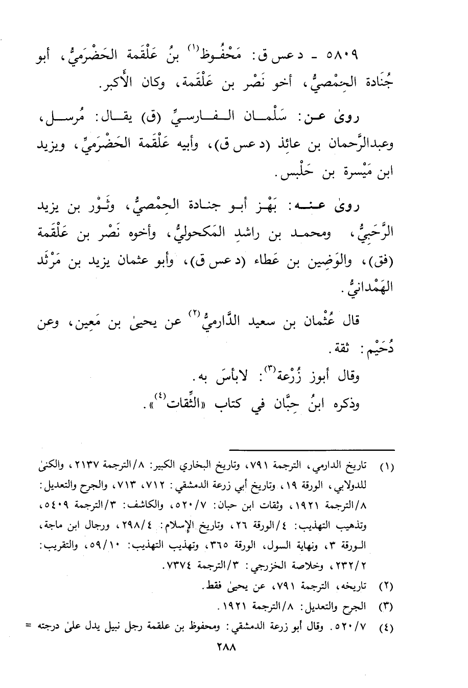 (4) 7 / 520. وَقَال أبو زُرْعَة الدمشقي: ومحفوظ ابن علقمة رجل نبيل يدل على درجته =