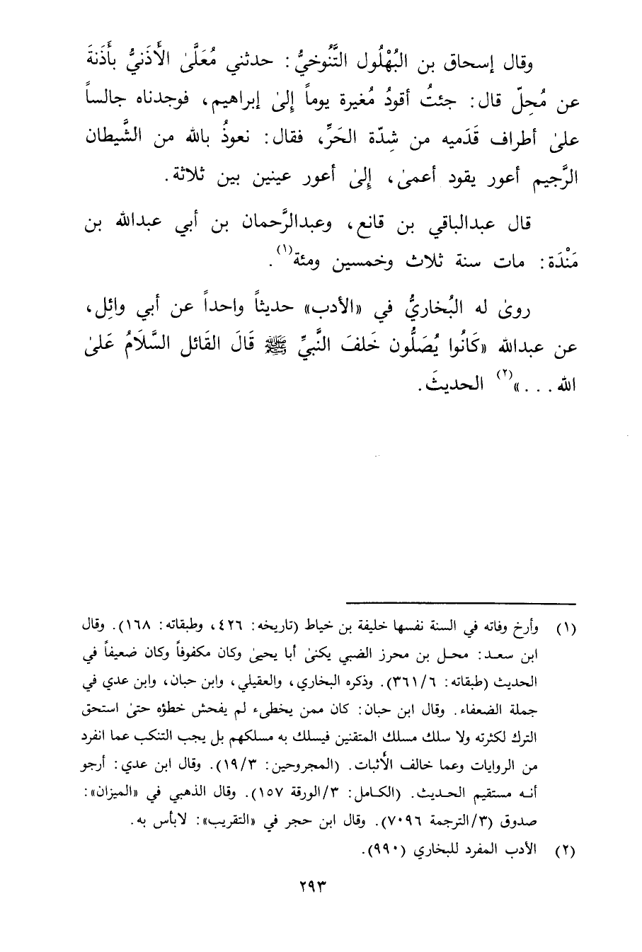 وَقَال إسحاق بْن البهلول التنوخي: حَدَّثَنِي معلى الأذني بأذنه عَنْ محل قال: جئت أقود مغيرة يوما إلى إبراهيم، فوجدناه جالسا على أطراف قدميه من شدة الحر، فقال: نعوذ بالله من الشيطان الرجيم أعور يقود أعمى، إلى أعور عينين بين ثلاثة.