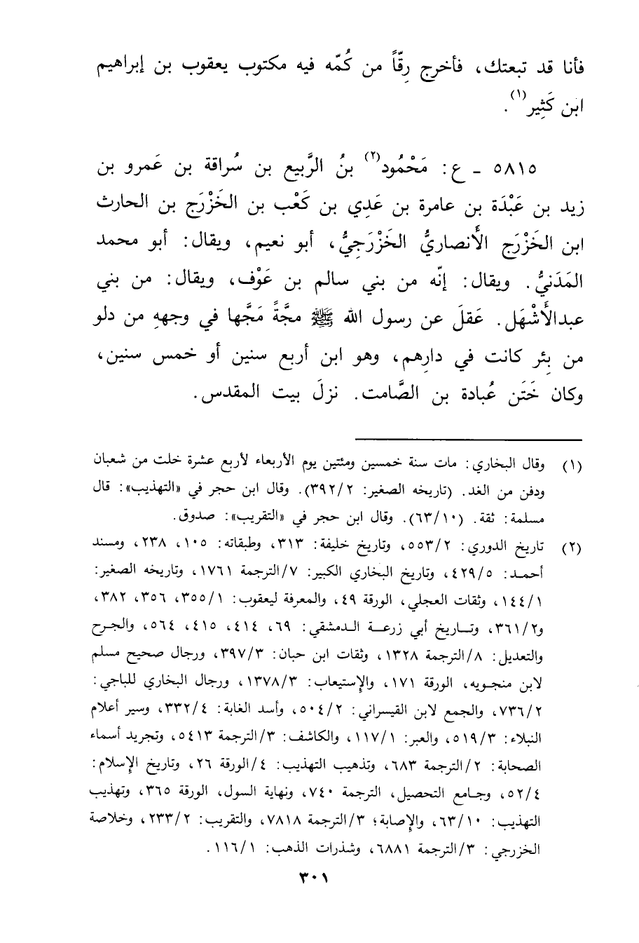 5815 - ع: محمود بن الربيع بن سراقة بن عَمْرو بن زيد بن عبدة بن عامرة بن عدي بن كعب بن الخزرج بن الحارث ابن الخزرج الأَنْصارِيّ الخزرجي (2) ، أَبُو نعيم، ويُقال: أبو محمد ابن الخزرج الأَنْصارِيّ الخزرجي، أَبُو نعيم، ويُقال: أَبُو مُحَمَّد المدني. ويُقال: إنه من بني سالم بْن عوف، ويُقال: من بني عَبْد الأشهل. عقل عَنْ رسول الله صَلَّى اللَّهُ عليه وسلم مجة مجها في وجهه من دلو من بئر كانت في دارهم، وهو ابن أربع سنين أو خمس سنين، وكان ختن عبادة بْن الصامت. نزل بيت المقدس.