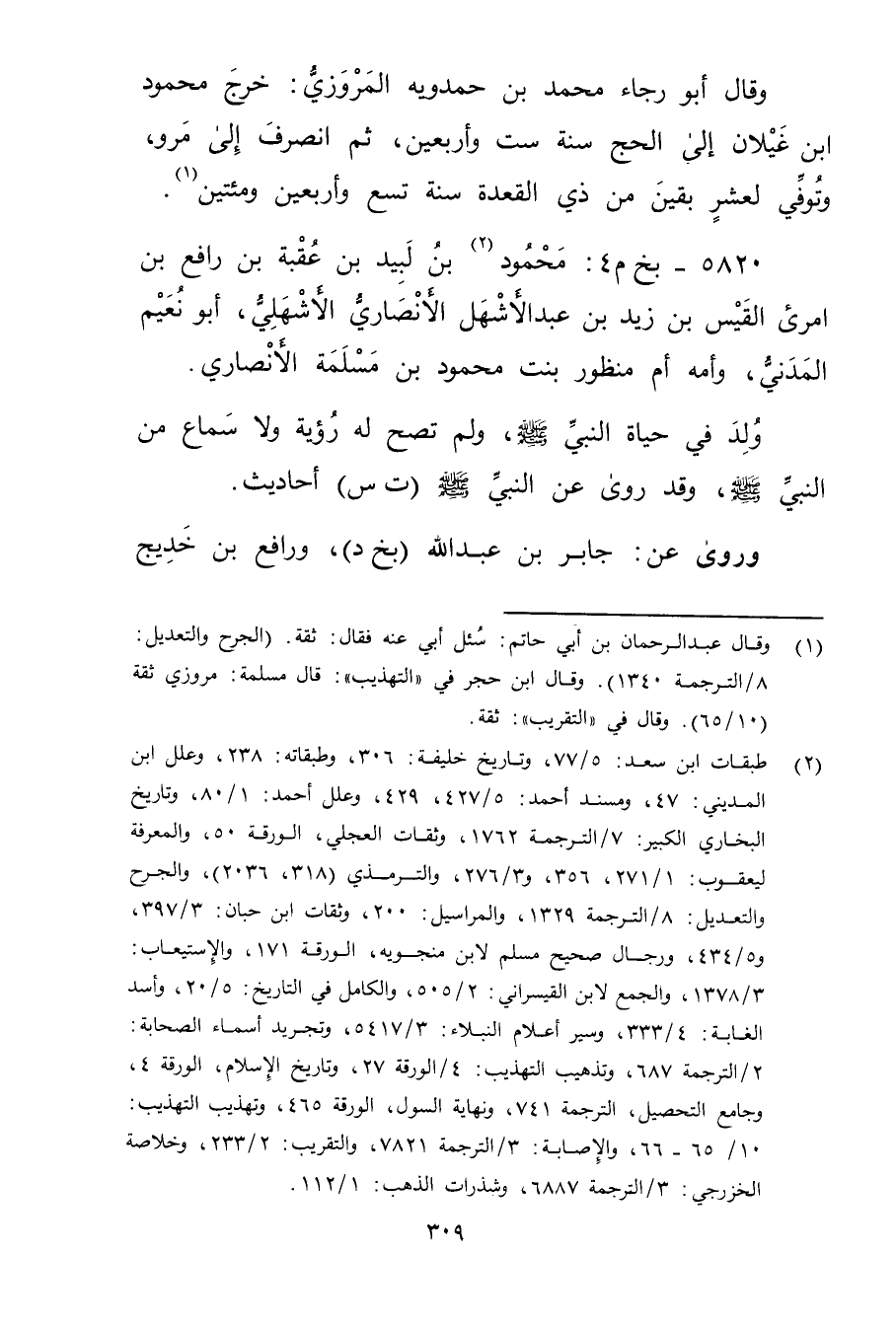 5820 - بخ م 4: محمود بن لبيد بن عقبة بن رافع بن امرئ القيس بْن زيد بْن عَبْد الأشهل الأَنْصارِيّ الأشهلي (2) ، أَبُو نعيم المدني، وأمه أم منظور بنت محمود بْن مسلمة الأَنْصارِيّ.