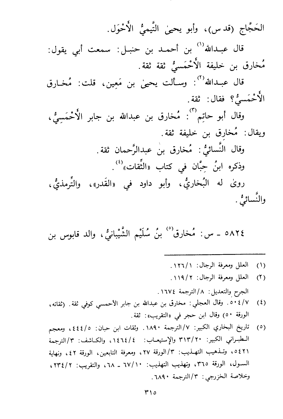 (5) تاريخ البخاري الكبير: 7 / الترجمة 1890. وثقات ابن حبان: 5 / 444، ومعجم الطبراني الكبير: 20 / 313 والاستيعاب: 4 / 1464، والكاشف: 3 / الترجمة 5421، وتذهيب التهذيب: 3 / الورقة 27، ومعرفة التابعين، الورقة 42، ونهاية السول، الورقة 365، وتهذيب التهذيب: 10 / 67 - 68، والتقريب: 2 / 234، وخلاصة الخزرجي: 3 / الترجمة 6890.
