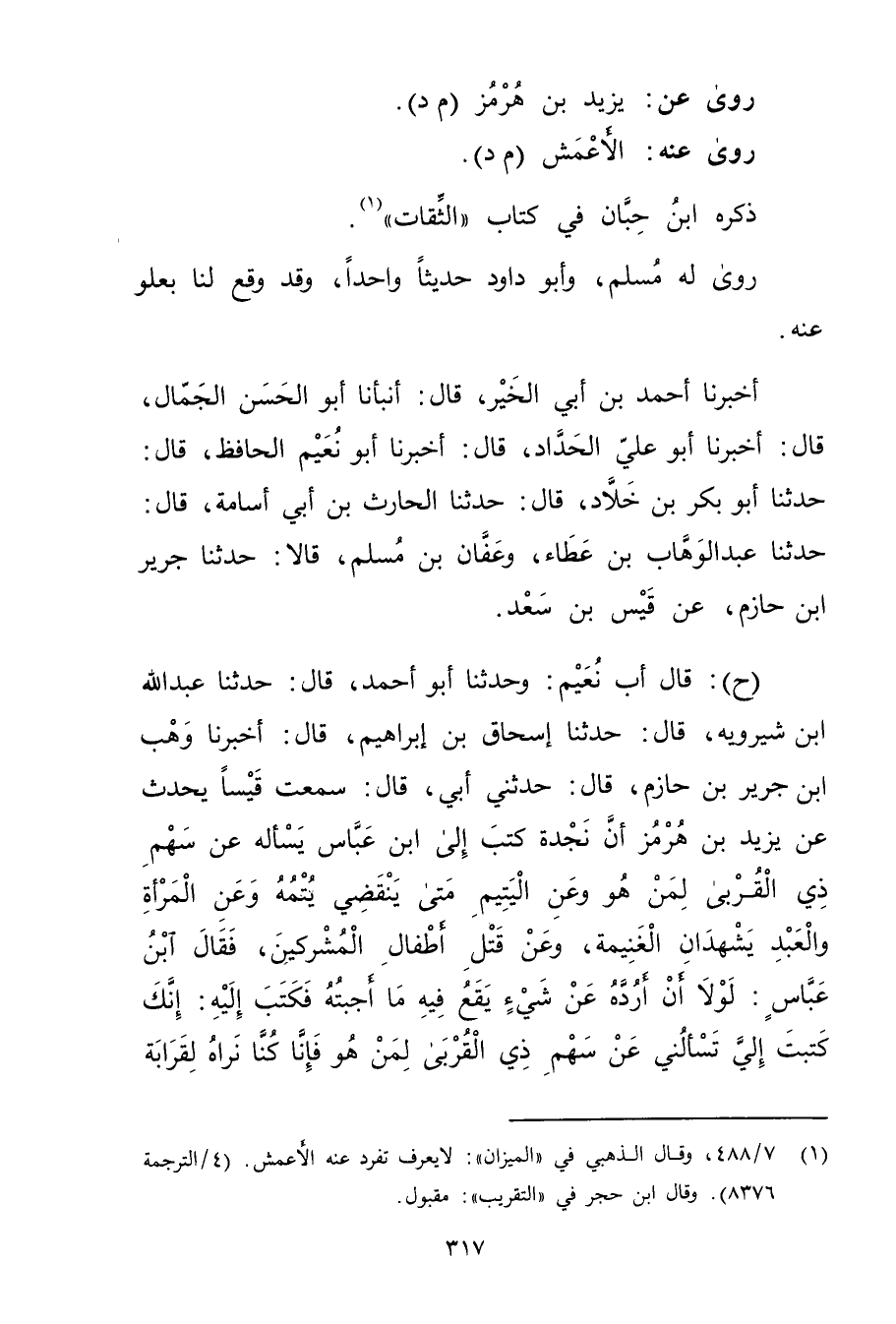 (ح) : قال أب نُعَيْمٍ: وحَدَّثَنَا أَبُو أَحْمَدَ، قال: حَدَّثَنَا عَبد اللَّهِ بْنُ شِيرَوَيْهِ، قال: حَدَّثَنَا إسحاق بْن إِبْرَاهِيم، قال: أخبرنا وهب ابن جَرِيرِ بْنِ حَازِمٍ، قال: حَدَّثني أبي، قال: سمعت قيساً يُحَدِّثُ عَنْ يَزِيدَ بْنِ هُرْمُزٍ أَنَّ نَجْدَةَ كَتَبَ إِلَى ابْنِ عَبَّاسٍ يَسْأَلُهُ عَنْ سَهْمِ ذِي الْقُرْبَى لِمَنْ هُوَ وعَنِ الْيَتِيمِ مَتَى يَنْقَضِي يُتْمُهُ وعَنِ الْمَرْأَةِ والْعَبْدِ يَشْهَدَانِ الْغَنِيمَةَ، وعَنْ قَتْلِ أَطْفَالِ الْمُشْرِكِينَ، فَقَالَ ابْنُ عَبَّاسِ: لَوْلا أَنْ أَرَدُّهُ عَنْ شَيْءٍ يَقَعُ فِيهِ مَا أَجَبْتُهُ فَكَتَبَ إِلَيْهِ: إِنَّكَ كَتَبْتَ إِلَيَّ تَسْأَلُنِي عَنْ سَهْمِ ذِي الْقُرْبَى لِمَنْ هُوَ فَإِنَّا كُنَّا نَرَاهُ لِقَرَابَةِ