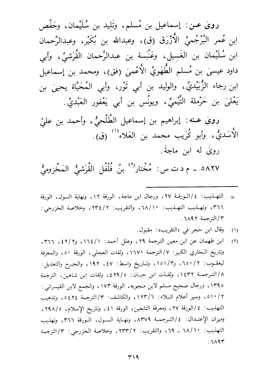 (2) ابن طهمان عن ابن مَعِين الترجمة 29، وعلل أحمد: 1 / 164، و2 / 42، 366، وتاريخ البخاري الكبير: 7 / الترجمة 1670، وثقات العجلي، الورقة 50، والمعرفة ليعقوب: 2 / 650، و3 / 151، وتاريخ واسط: 47، 192، والجرح والتعديل: 8 / الترجمة 1432، وثقات ابن حبان: 5 / 429، وثقات ابن شاهين، الترجمة 1395، ورجال صحيح مسلم لابن منجويه، الورقة 173، والجمع لابن القيسراني: 2 / 510، وسير أعلام النبلاء: 6 / 123، والكاشف: 3 / الترجمة 5424، وتذهيب التهذيب: 4 / الورقة 27، ومعرفة التابعين، الورقة 41، وتاريخ الاسلام، 5 / 298، وميزان الاعتدال: 4 / الترجمة 8379، ونهاية السول، الورقة 366، وتهذيب التهذيب: 10 / 68 - 69، والتقريب: 2 / 233، وخلاصة الخزرجي: 3 / الترجمة 6893.