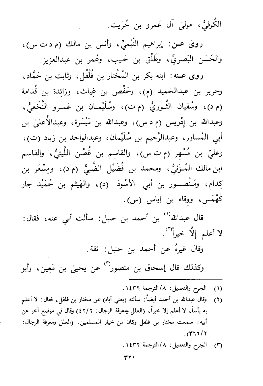 (2) وَقَال عَبد اللَّهِ بْن أَحْمَد أيضا: سألته (يعني أباه) عن مختار بن فلفل، فَقَالَ: لا أعلم بِهِ بأسا، لا أعلم إِلاَّ خَيْرًا، (العلل ومعرفة الرجال: 2 / 42) وَقَال فِي موضع آخر عَن أبيه: سمعت مختار بن فلفل وكان من خيار المسلمين. (العلل ومعرفة الرجال: 2 / 366) .