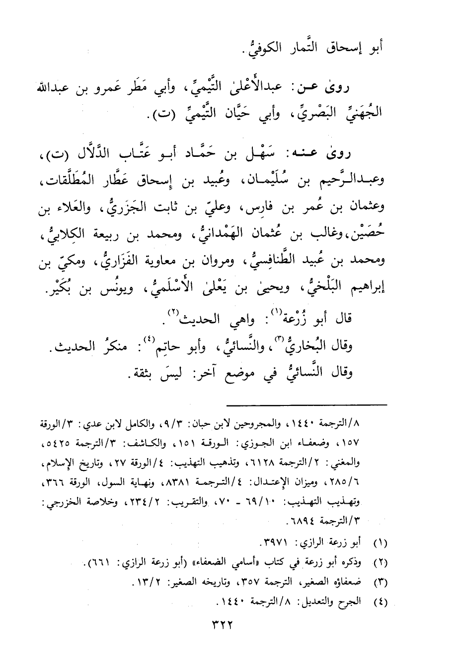 8 / الترجمة 1440، والمجروحين لابن حبان: 3 / 9، والكامل لابن عدي: 3 / الورقة 157، وضعفاء ابن الجوزي: الورقة 151، والكاشف: 3 / الترجمة 5425، والمغني: 2 / الترجمة 6128، وتذهيب التهذيب: 4 / الورقة 27، وتاريخ الاسلام، 6 / 285، وميزان الاعتدال: 4 / الترجمة 8381، ونهاية السول، الورقة 366، وتهذيب التهذيب: 10 / 69 - 70، والتقريب: 2 / 234، وخلاصة الخزرجي: 3 / الترجمة 6894.