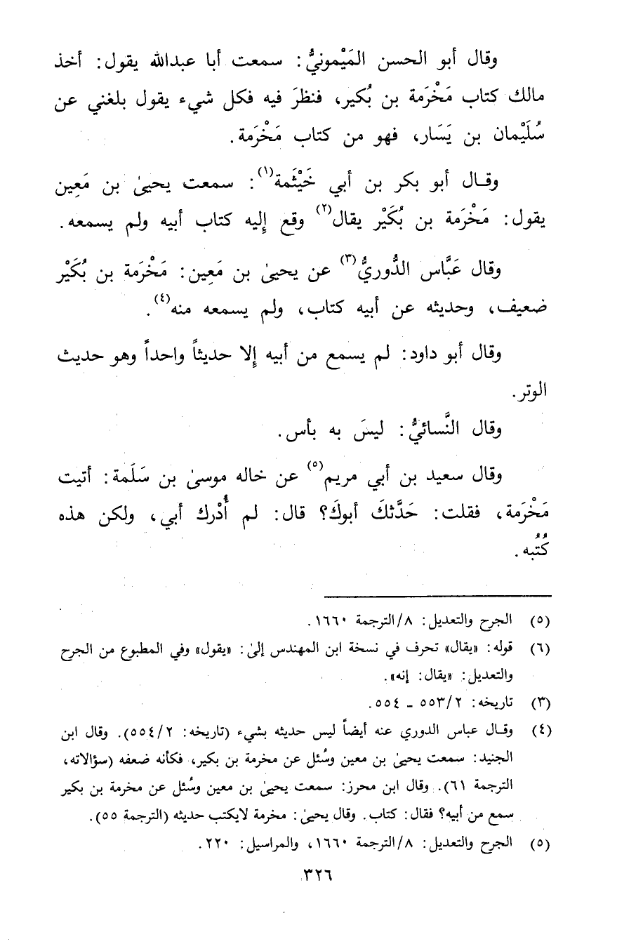 (4) وَقَال عَباس الدُّورِيُّ عنه أيضا ليس حديثه بشيءٍ (تاريخه: 2 / 554) . وَقَال ابن الجنيد: سمعت يَحْيَى بن مَعِين وسئل عن مخرمة بن بكير، فكأنه ضعفه (سؤالاته، الترجمة 61) . وَقَال ابن محرز: سمعت يحيى بْن مَعِين وسئل عن مخرمة بن بكير سمع من ابيه؟ فقال: كتاب. وَقَال يحيى: مخرمة لا يكتب حديثه (الترجمة 55) .