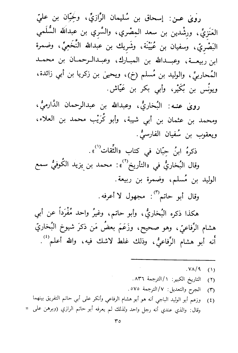 (4) وزعم أبو الوليد الباجي أنه هو أبو هشام الرفاعي وأنكر على أبي حاتم التفريق بينهما وَقَال: والذي عندي أنه رجل واحد ولذلك لم يعرفه أبو حاتم الرازي (وبرهن على =