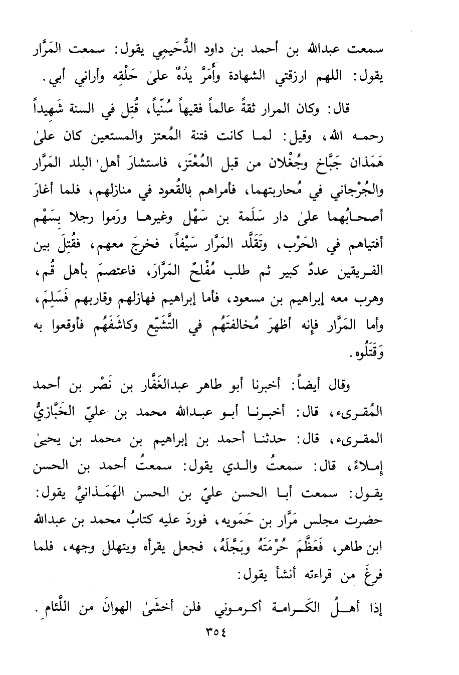 قال: وكان المرار ثقة عالما فقيها سنيا، قتل في السنة شهيدا رحمه الله، وقيل: لما كانت فتنة المعتز والمستعين كان على همذان جباخ وجغلان من قبل المعتز، فاستشار أهل البلد المرار والجرجاني في محاربتهما، فأمراهم بالقعود في منازلهم، فلما أغار أصحابهما على دار سلمة بْن سهل وغيرها ورموا رجلا بسهم أفتياهم في الحرب، وتقلد المرار سيفا، فخرج معهم، فقتل بين الفريقين عدد كبير ثم طلب مفلح المرار، فاعتصم بأهل قم، وهرب معه إبراهيم بْن مسعود، فأما إبراهيم فهازلهم وقاربهم فسلم، وأما المرار فإنه أظهر مخالفتهم في التشيع وكاشفهم فأوقعوا بِهِ وقتلوه.
