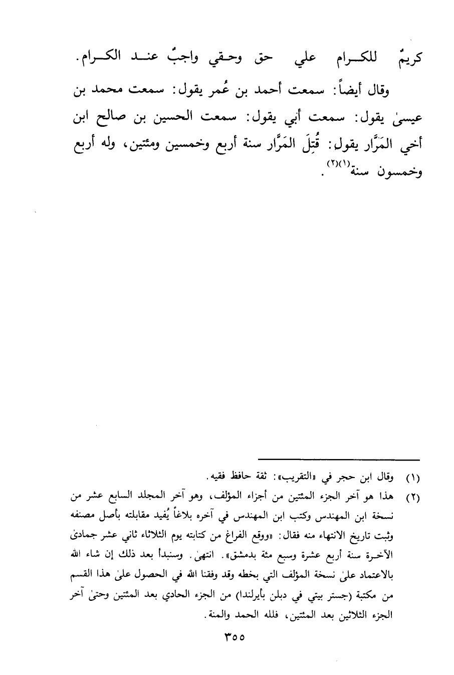 (2) هذا هو آخر الجزء المئتين من أجزاء المؤلف، وهو آخر المجلد السابع عشر من نسخة ابن المهندس وكتب ابن المهندس في آخره بلاغا يفيد مقابلته بأصل مصنفه وثبت تاريخ الانتهاء منه فقال: "ووقع الفراغ من كتابته يوم الثلاثاء ثاني عشر جمادى الآخرة سنة أربع عشرة وسبع مئة بدمشق ". انتهى. وسنبدأ بع ذلك إن شاء الله بالاعتماد على نسخة المؤلف التي بخطه وقد وفقنا الله في الحصول على هذا القسم من مكتبة (جستر بيتي في دبلن بأيرلندا) من الجزء الحادي بعد المئتين وحتى آخر الجزء الثلاثين بعد المئتين، فلله الحمد والمنة.