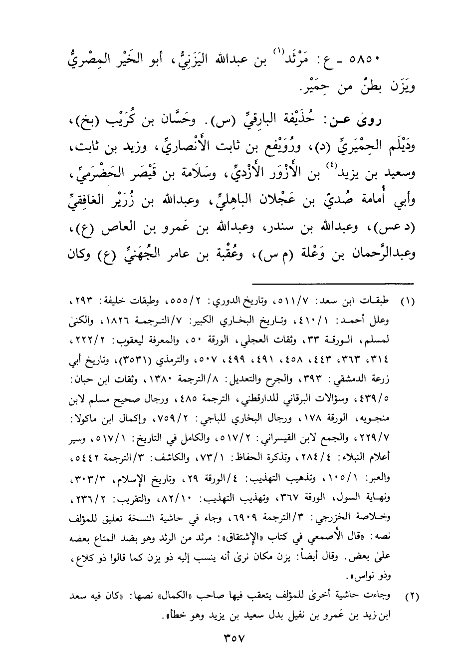 (1) طبقات ابن سعد: 7 / 511، وتاريخ الدوري: 2 / 555، وطبقات خليفة: 293، وعلل أحمد: 1 / 410، وتاريخ البخاري الكبير: 7 / الترجمة 1826، والكنى لمسلم، الورقة 33، وثقات العجلي، الورقة 50، والمعرفة ليعقوب: 2 / 222، 314، 363، 443، 458، 491، 499، 507، والتِّرْمِذِيّ (3531) ، وتاريخ أبي زرعة الدمشقي: 393، والجرح والتعديل: 8 / الترجمة 1380، وثقات ابن حبان: 5 / 439، وسؤالات البرقاني للدارقطني، الترجمة 485، ورجال صحيح مسلم لابن منجويه، الورقة 178، ورجال البخاري للباجي: 2 / 759، وإكمال ابن ماكولا: 7 / 229، والجمع لابن القيسراني: 2 / 517، والكامل في التاريخ: 1 / 517، وسير أعلام النبلاء: 4 / 284، وتذكرة الحفاظ: 1 / 73، والكاشف: 3 / الترجمة 5442، والعبر: 1 / 105، وتذهيب التهذيب: 4 / الورقة 29، وتاريخ الاسلام، 3 / 303، ونهاية السول، الورقة 367، وتهذيب التهذيب: 10 / 82، والتقريب: 2 / 236، وخلاصة الخزرجي: 3 / الترجمة 6909، وجاء في حاشية النسخة تعليق للمؤلف نصه: "قال الأَصْمَعِيّ في كتاب "الاشتقاق ": مرثد من الرثد وهو بضد المتاع بعضه على بعض. وَقَال أيضا: يزن مكان نرى أنه ينسب إليه ذو يزن كما قالوا ذو كلاع، وذو نواس.