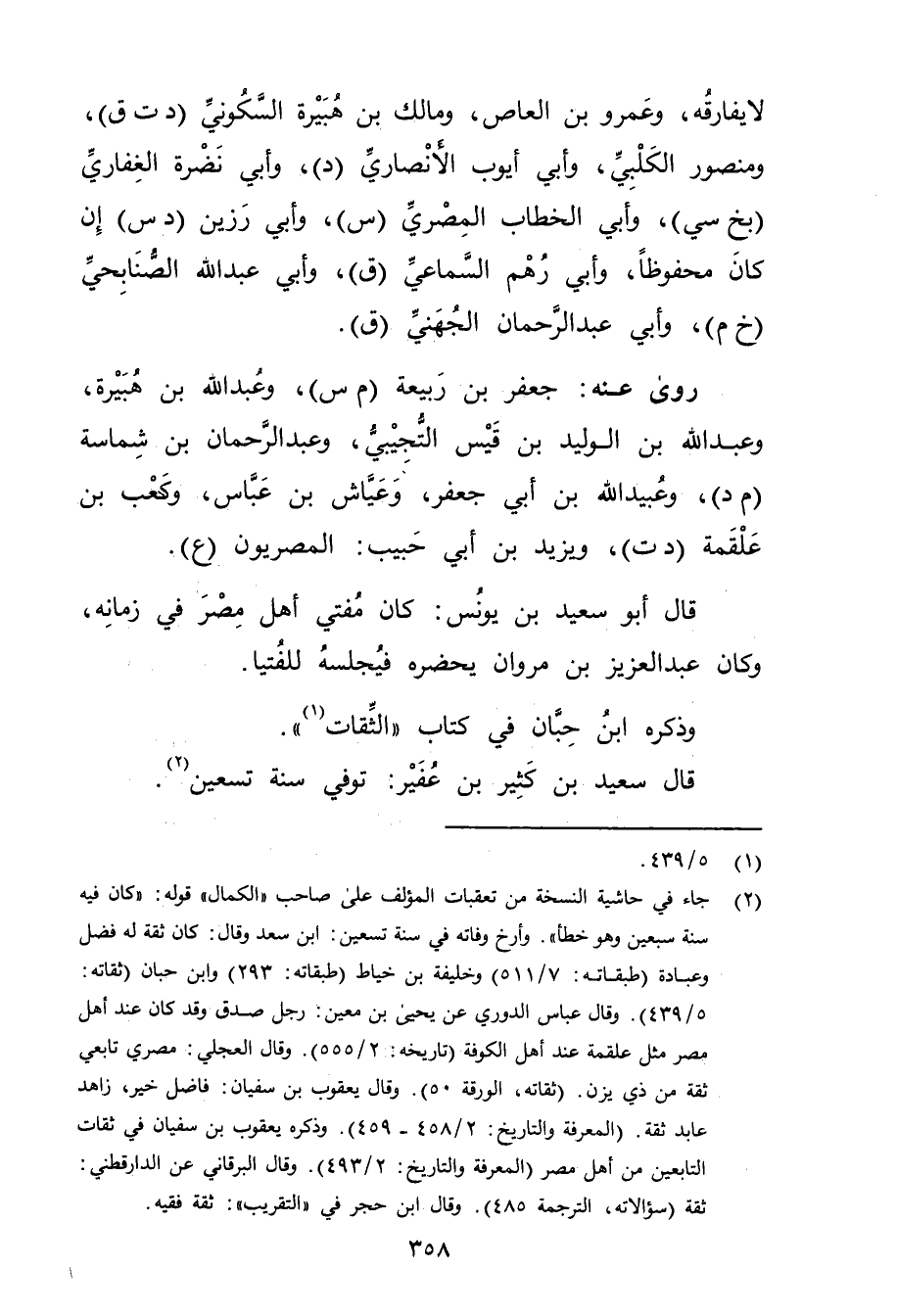 (2) جاء في حاشية النسخة من تعقبات المؤلف على صاحب "الكمال "قوله: "كان فيه سنة سبعين وهو خطأ ". وأرخ وفاته في سنة تسعين: ابن سعد وَقَال: كان ثقة له فضل وعبادة (طبقاته: 7 / 511) وخليفة بن خياط (طبقاته: 293) وابن حبان (ثقاته: 5 / 439) . وَقَال عَباس الدُّورِيُّ عَن يحيى بن مَعِين: رجل صدق وقد كان عند أهل مصر مثل علقمة عند أهل الكوفة (تاريخه: 2 / 555) . وَقَال العجلي: مصري تابعي ثقة من ذي يزن. (ثقاته، الورقة 50) . وَقَال يعقوب بن سفيان: فاضل خير، زاهد عابد ثقة. (المعرفة والتاريخ: 2 / 458 - 459) ، وذَكَره يعقوب بْن سفيان في ثقات التابعين من أهل مصر (المعرفة والتاريخ: 2 / 493) . وَقَال البرقاني عن الدارقطني: ثقة (سؤالاته، الترجمة 485) . وَقَال ابن حجر في "التقريب": ثقة فقيه.